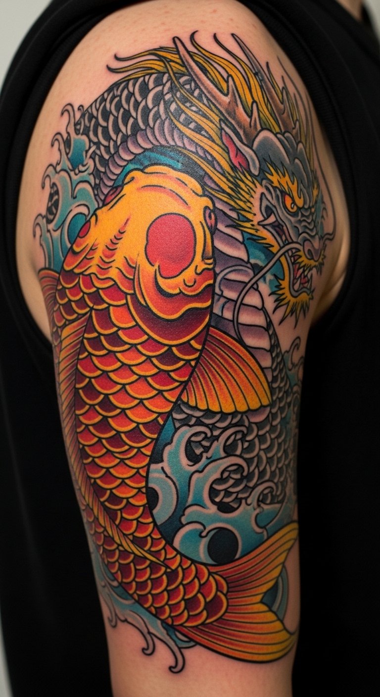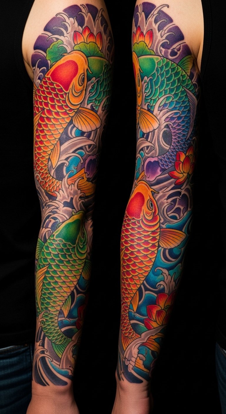 Colorful koi sleeves burst with hues. They tell stories of vibrancy. Artists pick this for flair. Plan colors on a large sheet. Use colored paper. Break it into sections for cost. A full sleeve is $200. Wrap it around your arm. Mix in other fish. This design expresses your world. Try color combos with paints. Buy cheap sets. Get advice from creators. You’ll stand out boldly.