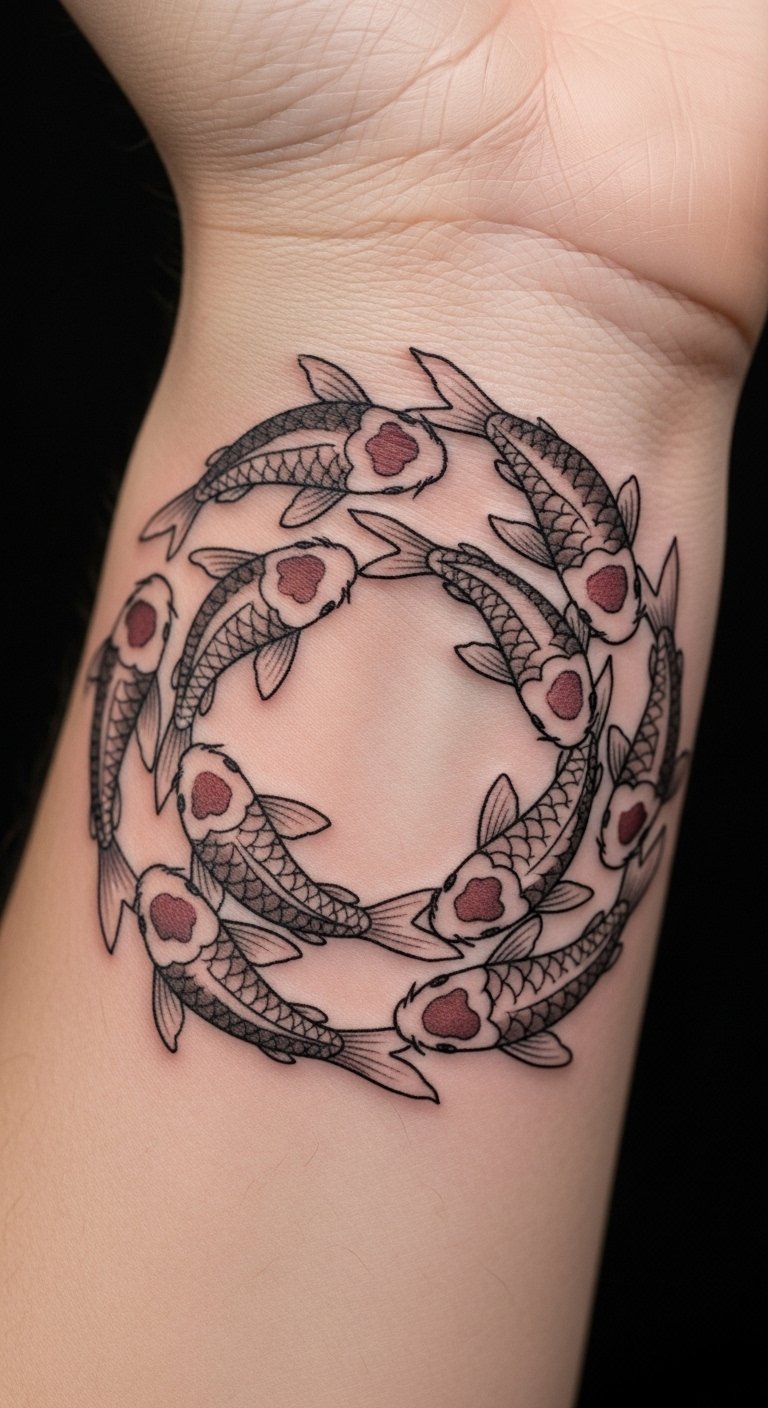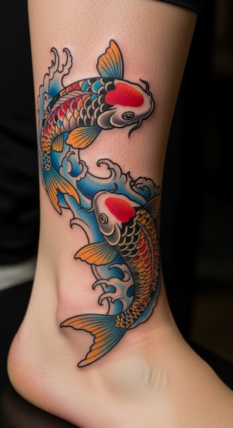 Koi ankle wraps keep you grounded. They mean stability in steps. Walkers choose this for paths. Draw it around your wrist first. Use a ribbon. Simplify for low cost. This is $70. Place it on your ankle. Include water flow. This tattoo steps with you. Try wrap designs with string. It’s free. Talk to walkers. You’ll stay rooted.