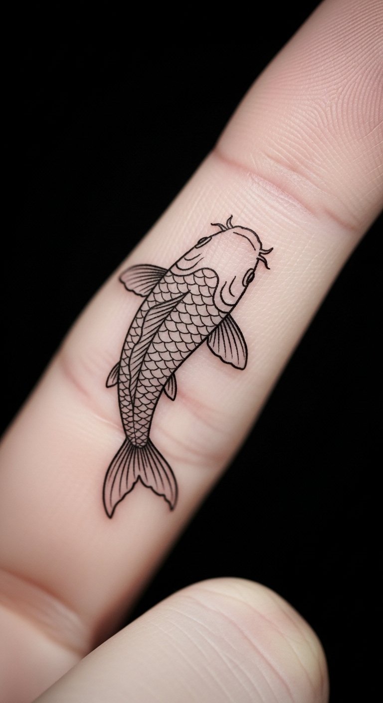 Minimalist koi keeps it clean and strong. It uses few lines for impact. Busy people choose this for ease. Scribble basic shapes on paper. Use a sharpie. This style is wallet-friendly at $50. Put it on your finger for quick wear. No extras needed. This tattoo says a lot with little. Practice with dot drawings. Use free stencils. Share with peers. You’ll appreciate the clean look.
