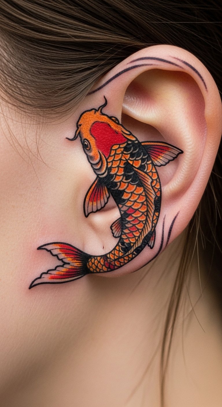 Small koi tattoos pack power in tiny spots. They mean strength without show. Daily folks get this for subtlety. Draw a mini version on your hand. Use a fine-tip pen. It’s quick and free. This one costs $60. Hide it behind your ear. Add a dot for accent. This tattoo reminds you quietly. Test with small stickers. They stick easy. Chat with close pals. You’ll carry power discreetly.