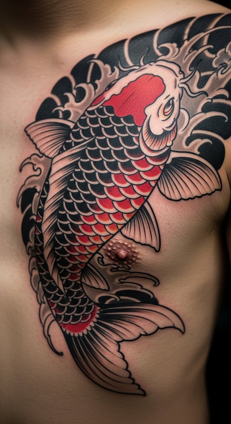 Chest koi tattoos hit the core. They stand for heart strength. Emotional people get this for depth. Sketch over your chest mirror. Use washable markers. Focus on the center. Around $150. Put it right on your heart. Add rays for light. This design beats with you. Practice with heart drawings. Use paper. Share feelings with friends. You’ll feel it deeply.