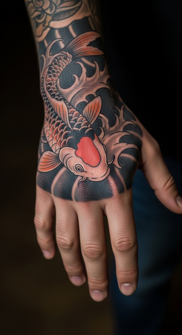 Koi hand tattoos show vigor openly. They mean action in sight. Doers choose this for display. Draw on your palm lightly. Use a pen. Keep it visible. This one is $90. Ink it on your hand. Include fins for motion. This tattoo moves with you. Test with hand sketches. Use your fingers. Discuss with hands-on friends. You’ll see your strength.