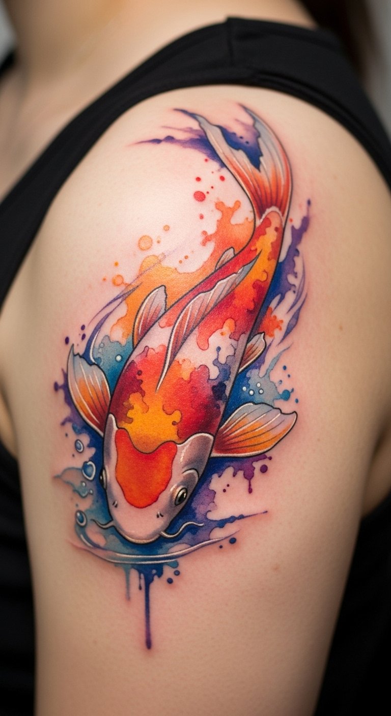 Watercolor koi tattoos flow like art. They blend colors for beauty. Creatives pick this for style. Dabble with water paints at home. Use old brushes. Mix shades simply. About $120. Place it on your shoulder. Let colors run free. This design paints your story. Experiment with blends on paper. Buy basic sets. Chat with artists. You’ll flow creatively.