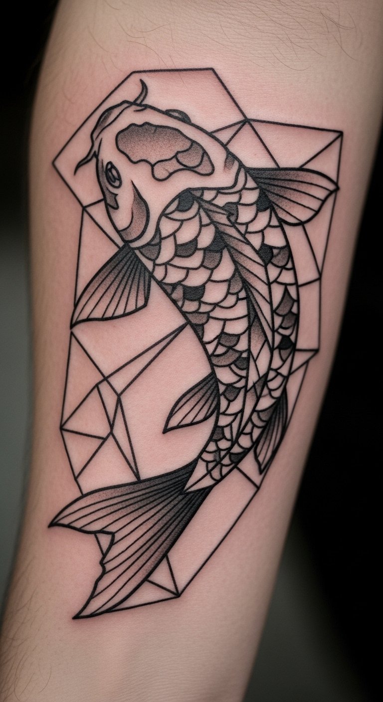 Geometric koi tattoos build with shapes. They mean solid strength. Thinkers choose this for form. Draw shapes with a ruler. Use household items. Keep patterns neat. This is $80. Put it on your forearm. Add triangles for edge. This design structures your power. Practice with geometric tools. It’s easy. Share with planners. You’ll build confidence.