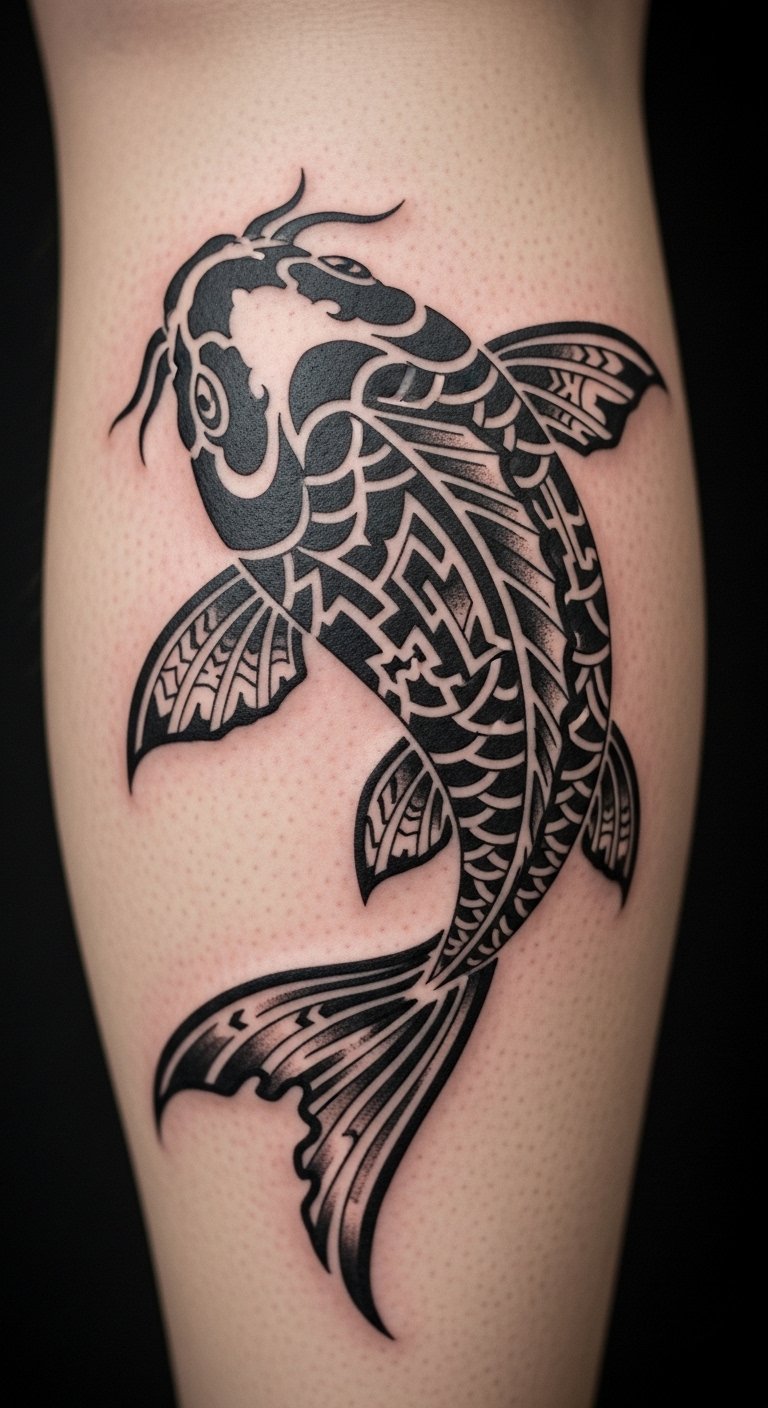 Tribal koi tattoos mix cultures boldly. They fuse patterns for edge. Explorers get this for roots. Sketch tribal lines first. Use free templates. Combine simply. About $100. Ink it on your calf. Add patterns around. This design edges your story. Try tribal drawings. Use pens. Discuss with travelers. You’ll feel the fusion.