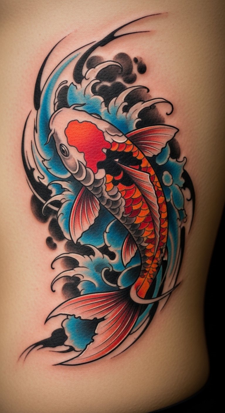 Abstract koi tattoos express freely. They twist forms for imagination. Dreamers choose this for play. Doodle abstract ideas on paper. Use colors you like. Keep it loose. About $110. Put it on your side. Swirl elements together. This design expresses your vibe. Experiment with abstract art. Use markers. Talk to dreamers. You’ll free your creativity.