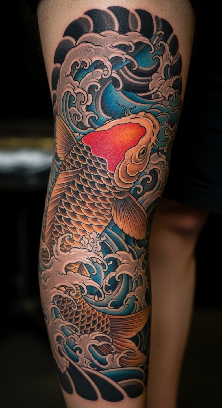 Koi with waves tattoos ride life’s tides. They mean navigating ups and downs. Surfers pick this for flow. Draw waves with the fish. Use blue inks. Make it wavy. This is $90. Tattoo it on your leg. Include foam details. This design rides with you. Practice with wave drawings. Use paper. Share with adventurers. You’ll handle the tides.