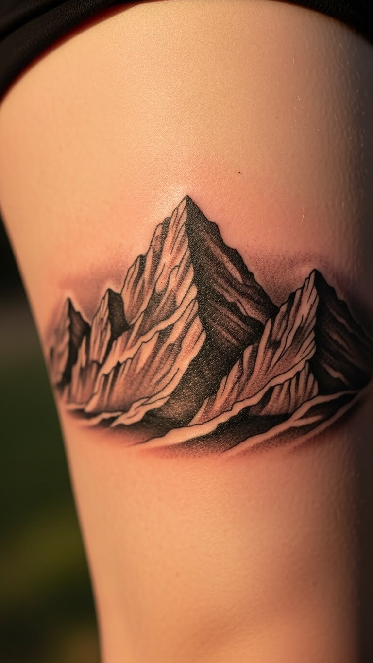Bring the outdoors in with a mountains tattoo on your thigh. Picture peaks and trees that follow your leg’s shape for a natural flow. Sketch mountains from photos you take on hikes—it’s free and fun. Keep it budget-friendly at $150 by going for outlines first. Try drawing with colored pencils on your skin as a trial. Place it on the back of your thigh for easy concealment. Incorporate stars for a night sky vibe using simple tools at home. Seek artists who do nature themes at lower rates. This design moves with you, enhancing your active style. Basic lotion keeps it fresh. It’s a simple addition to your daily outfit.