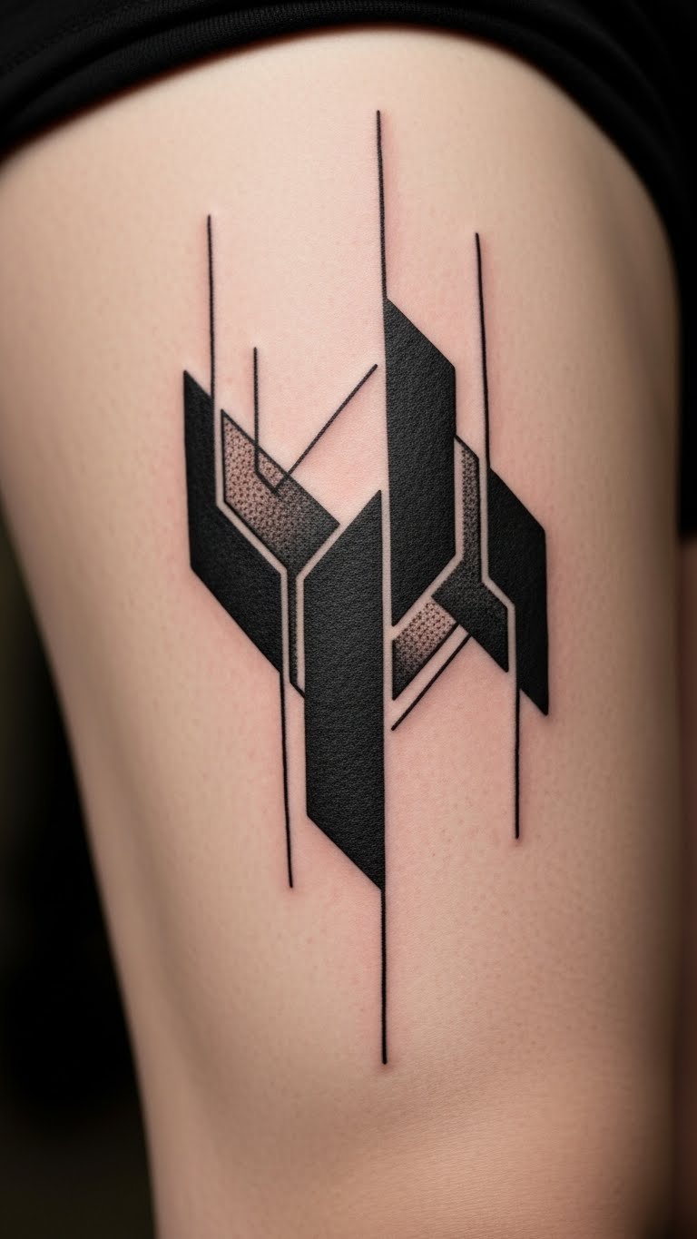 Play with asymmetrical geometry on your thigh for creativity. Uneven lines add surprise. Sketch imbalances on paper. Cost about $140. Test with asymmetrical stickers. Fit it to your thigh’s natural form. Use free design apps. Look for creative session rates. This tattoo shifts with your body. Simple care maintains the look. It’s an innovative personal touch.