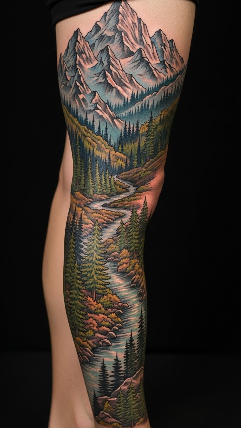 Cover your leg with a nature scene for immersion. Trees and hills create a landscape. Plan in parts. Budget $250 total. Use photos to practice. Layer for depth. Seek nature deals. This tattoo brings the wild to you. Simple care keeps it vivid. It’s a immersive style element.