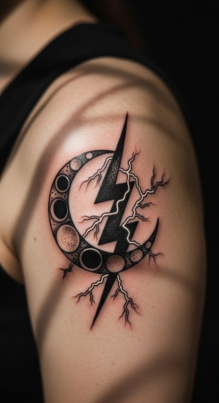 Celestial Duality: Moon and Lightning Tattoos