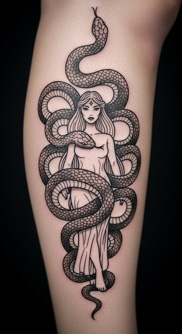 Wrap Lilith in serpents for a mysterious vibe. This design uses simple curves. Snakes coil around her figure nicely. Find budget artists charging $100. Draw snakes freehand at home first. Use online templates to guide you. Put it on your leg for easy viewing. Choose one color to keep costs down. Protect it with clothing while healing. Try adding small dots for extra flair. This tattoo speaks of hidden power. Apply sunscreen once it’s done. Get feedback from trusted people.