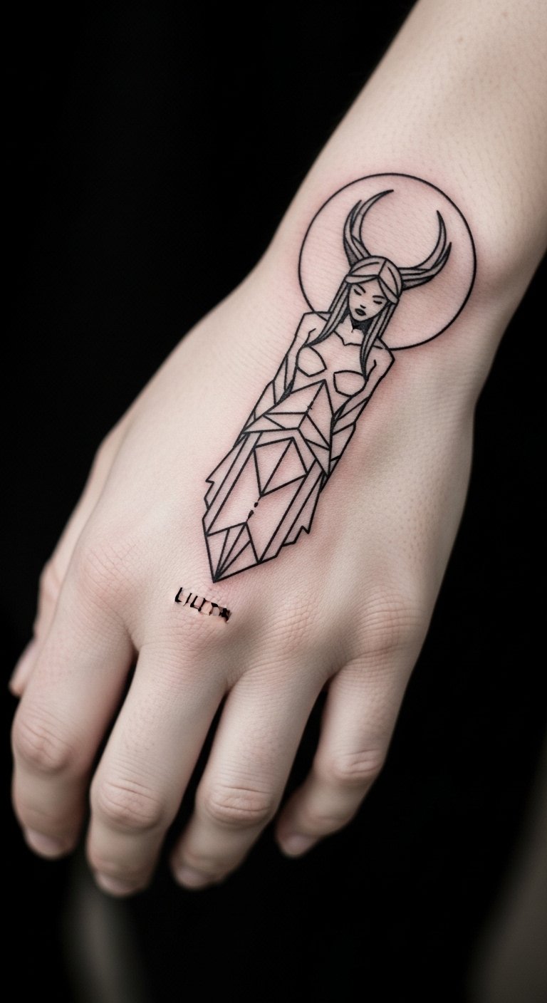 Go abstract with Lilith for a modern feel. Use geometric shapes like triangles. It keeps the design fresh and simple. Artists do this for under $80. Experiment with shapes using free apps. Draw it on your skin with a pen first. Place it on your hand for constant visibility. Stick to basic lines to save money. Wash the area gently after. This tattoo boosts your confidence quietly. Share your sketch with artists for tweaks.