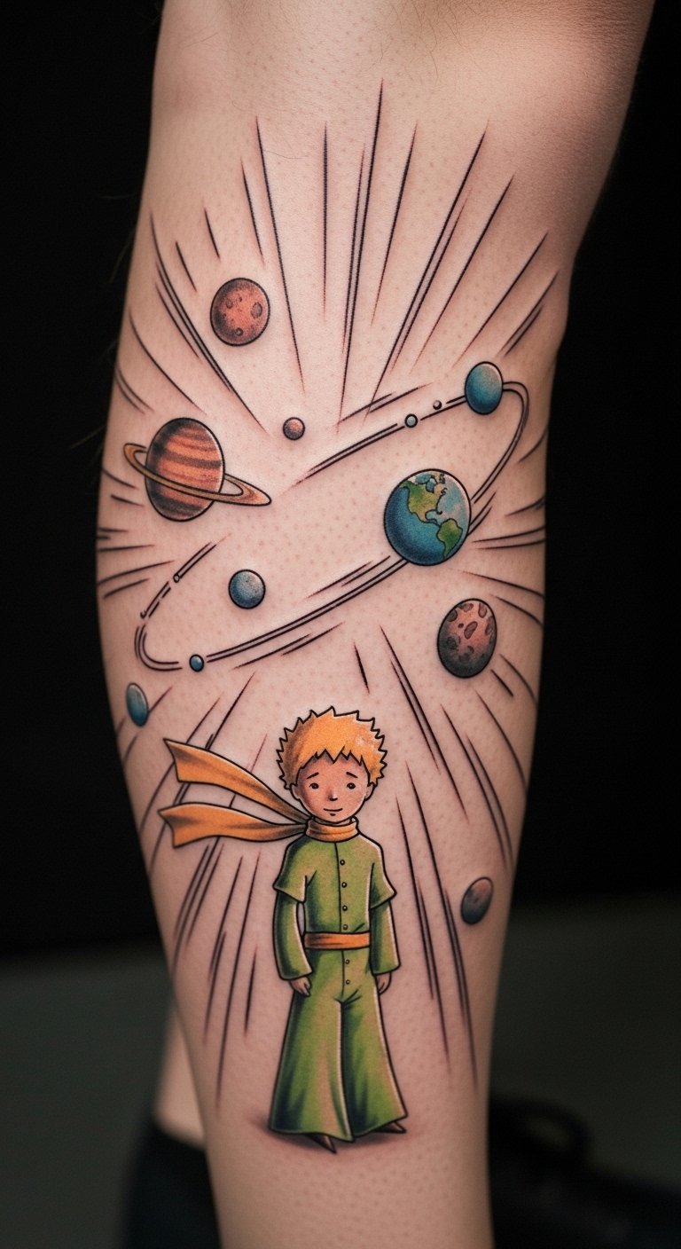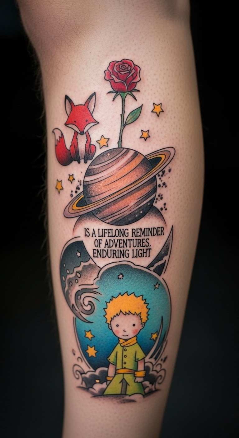 Create a cosmic journey with stars and the prince. This scene evokes exploration in a compact way. Draw stars on paper as a fun home project. Use free digital tools to add planets without hassle. Budget tip: Find group tattoo sessions online for prices around $150, covering multiple elements. Choose smaller versions to stay thrifty. Place it on your shoulder for inspiration. Experiment with stick-on stars from craft kits as a trial. Keep it light to maintain that adventure spirit. You’ll carry a piece of the universe everywhere.