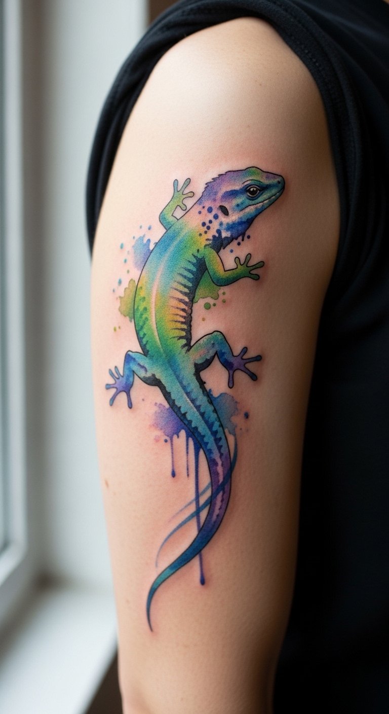 Watercolor lizard tattoos offer soft blends. It’s artistic and fluid. Experiment with watercolors at home. This is affordable fun. Free videos teach techniques. Find a budget artist. Use fewer blends to keep costs down, about $75. Place it on your body creatively. Try paper versions first. Use paints you have. Mix colors simply. It’s engaging. Get feedback from friends. Your design will flow beautifully.