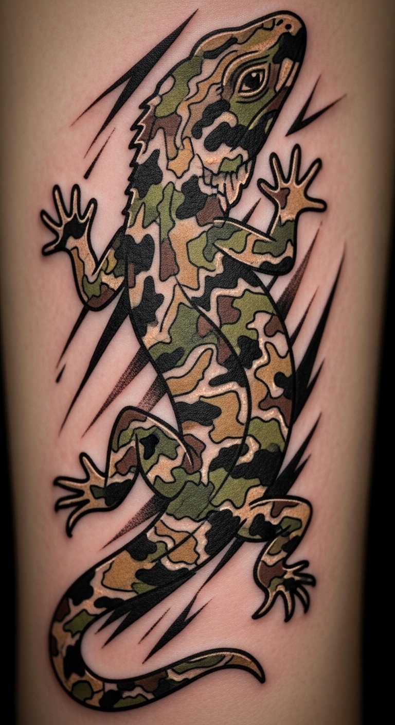 Forest camo lizard style merges with nature. It’s earthy and smart. Draw leaves around it. Use paper. Free nature designs. Go to a budget place. Keep patterns basic for savings, about $70. Put it on your leg. Create a leaf mask at home. Add with greens. It’s grounded. Show to pals. Your tattoo will feel wild.