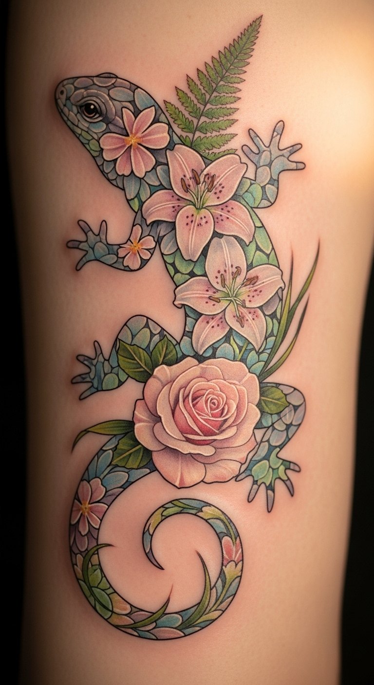 Floral lizard design grows with beauty. It’s harmonious and fresh. Draw flowers around it. Use petals. Free floral guides. Visit a studio. Use basic blooms to save, about $70. Put it on your arm. Create a petal sketch. Do it yourself. Add naturally. It’s blooming. Share with pals. Your tattoo will flourish.