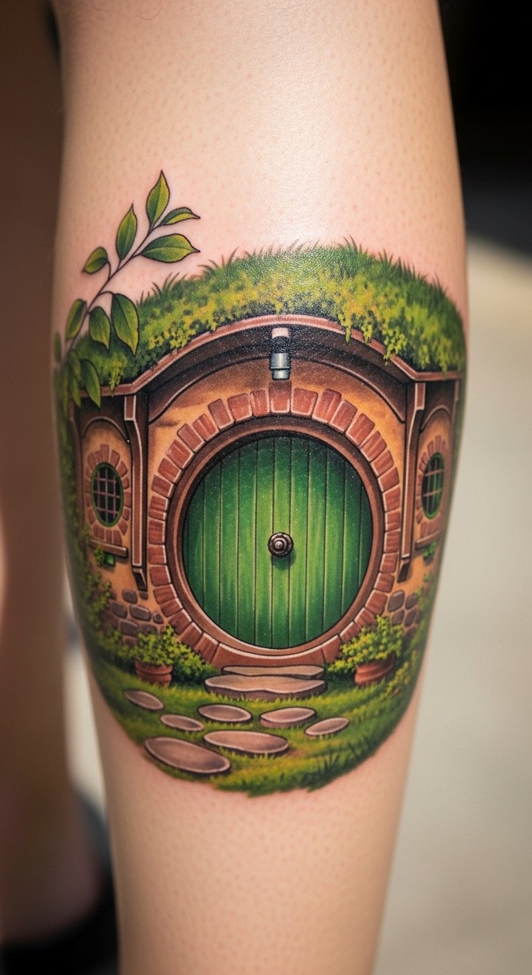A Hobbit hole on your calf brings whimsy and comfort. It shows peaceful vibes from the Shire. Draw hills on paper with crayons at home. Choose colorful versions but check for extra fees. Budget tip: Opt for smaller sizes at affordable shops. DIY idea: Create paper cutouts to visualize on your leg. This tattoo invites relaxation and works for casual days. Moisturize with your everyday cream to maintain it.