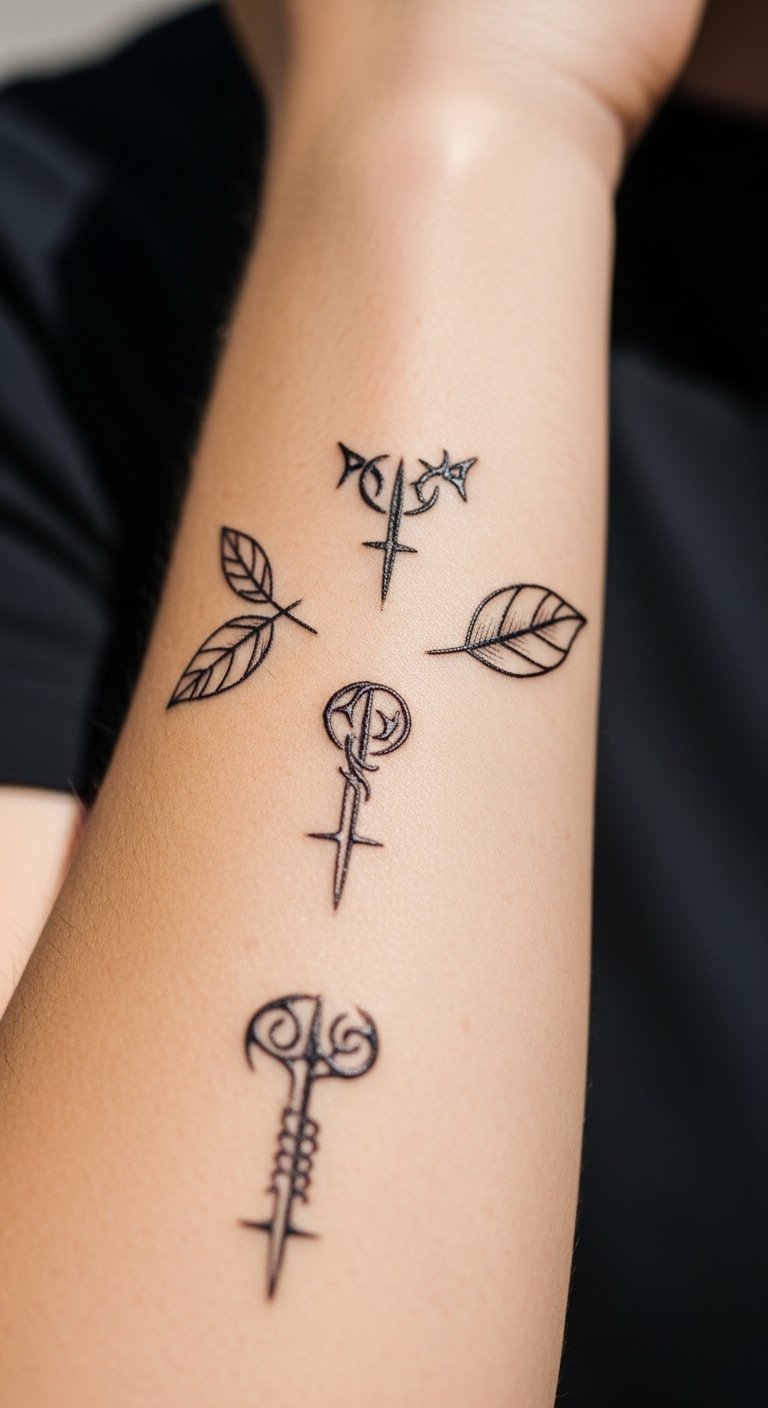 Forearm symbols, like leaves, keep it meaningful. They represent nature and heritage. Draw options at home. Select small ones for quick, cheap sessions. Use phone for ideas. DIY example: Stick decals on arm to test. This tattoo motivates daily and fits any outfit. Protect with sunscreen.