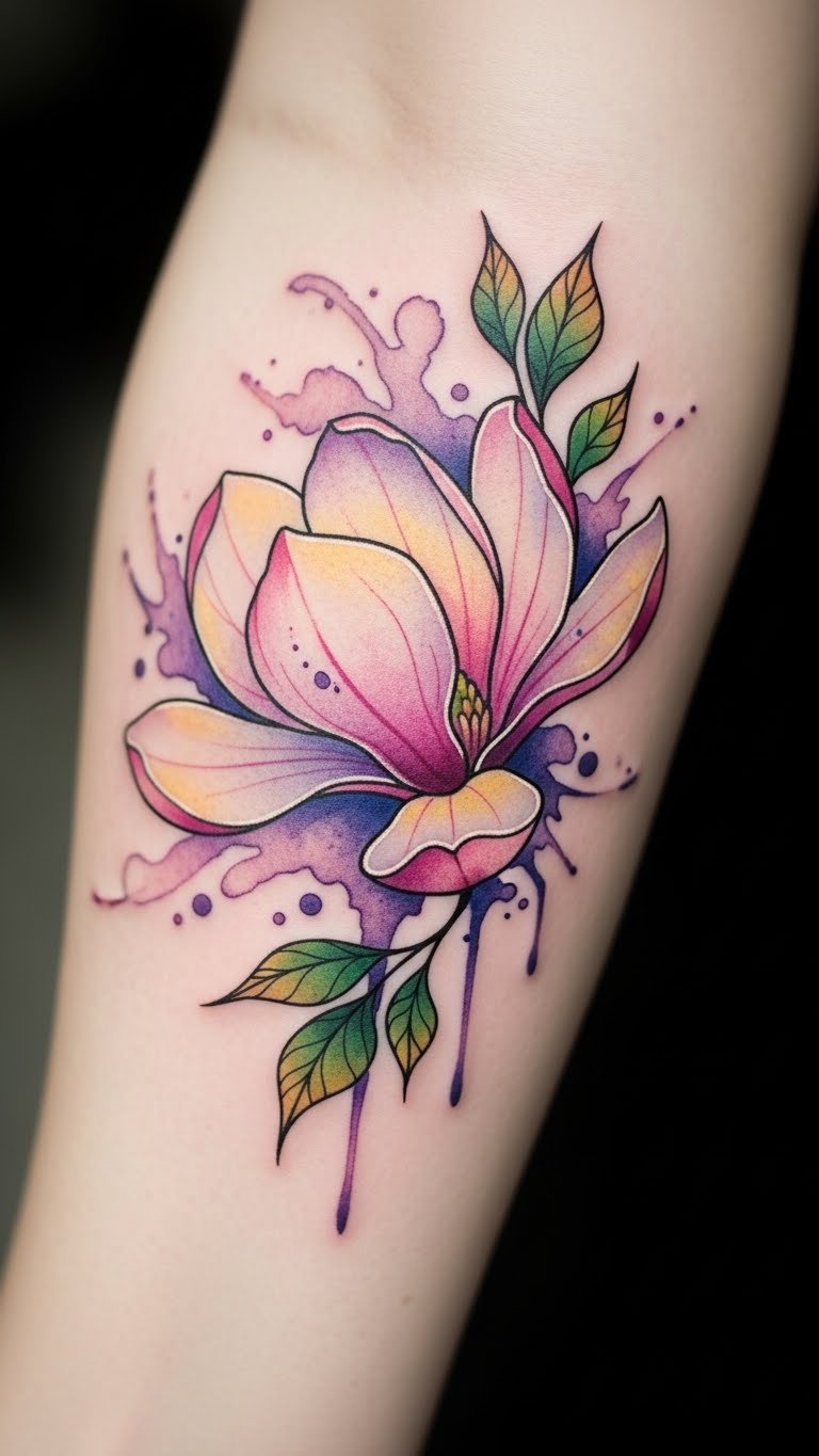 Go for a watercolor magnolia on your arm. It looks like a painting. Colors blend smoothly. Draw inspiration from home art supplies. Use watercolors on paper to test shades. This saves money. Find an artist who charges $150 or less. They apply gentle techniques. Short sessions work best. Break the process into steps. First session for outlines. Second for colors. It represents grace. Place it where you see it often. Add pink for kindness. Practice with face paints at home. They cost $10. Experiment on your hand. See how it feels. Bold the key: watercolor style. Keep designs affordable.