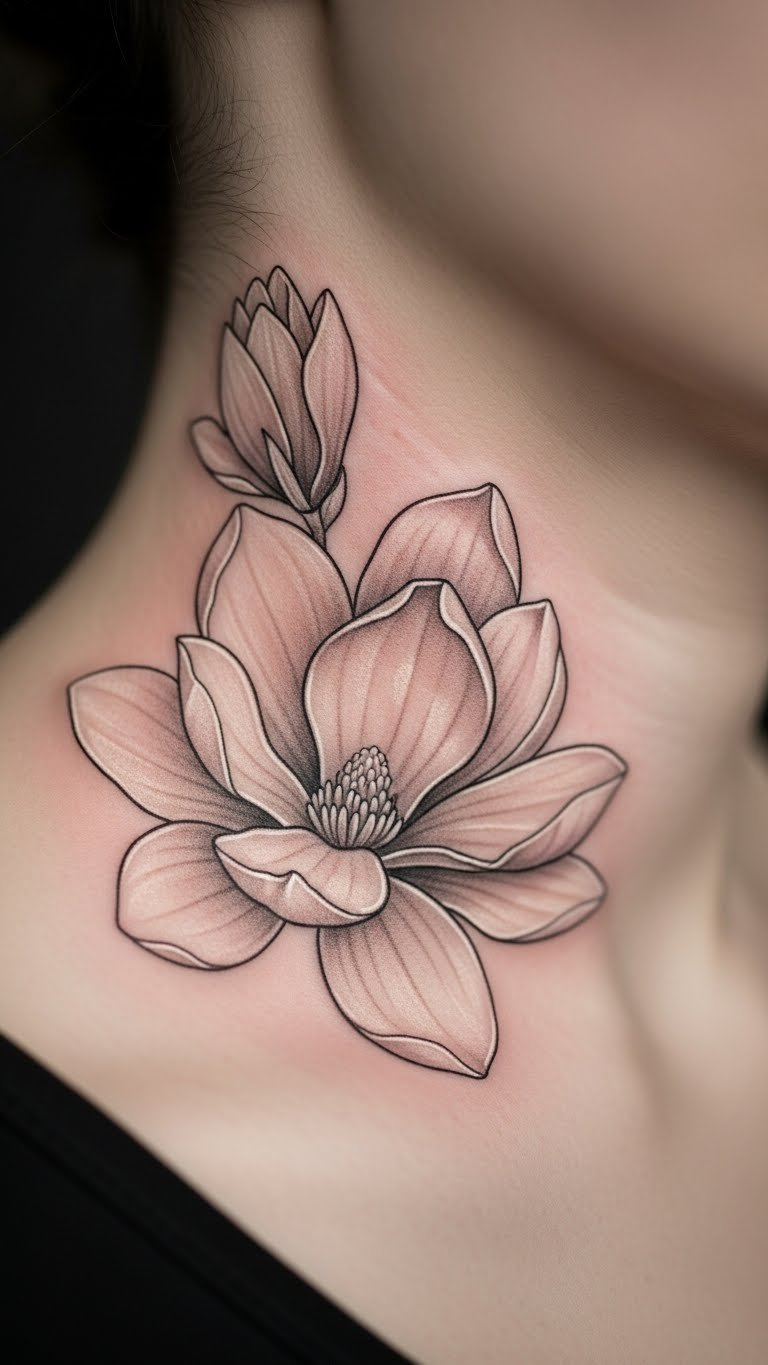 White magnolia shows purity. Try your neck. Outline with white chalk first. It’s cheap. Artists charge $120. Use light shades. Bold the key: white purity. Test with white-out on paper. Quick and easy.