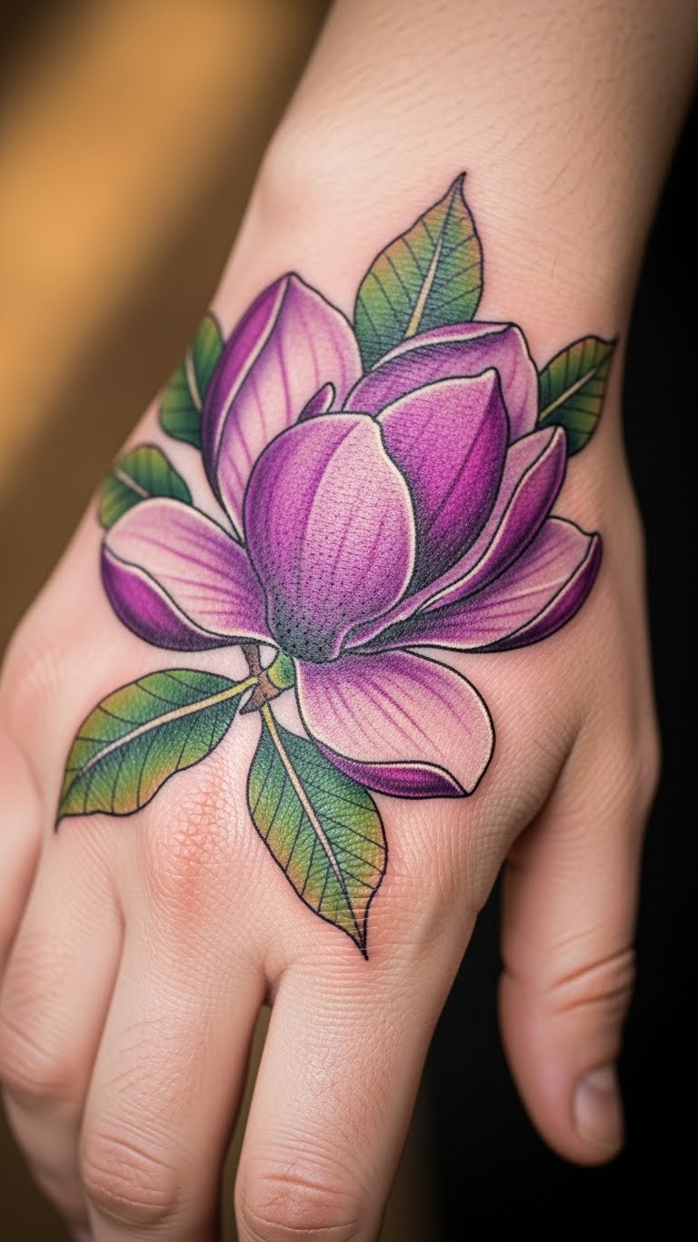 Think about a small magnolia on your wrist. It fits daily life. You get a quick reminder of growth. Start with a sketch on paper. Use a pen to draw the flower. This helps plan the design. Pick a local artist for under $100. They use basic tools. Keep it simple. No extra details. This style heals fast on sensitive areas. Try a temporary sticker first. It costs less than $5. Wear it for a week. See if you like it. Bold the key: wrist tattoo. Mix with daily routines. Touch it during tough moments. It symbolizes endurance.