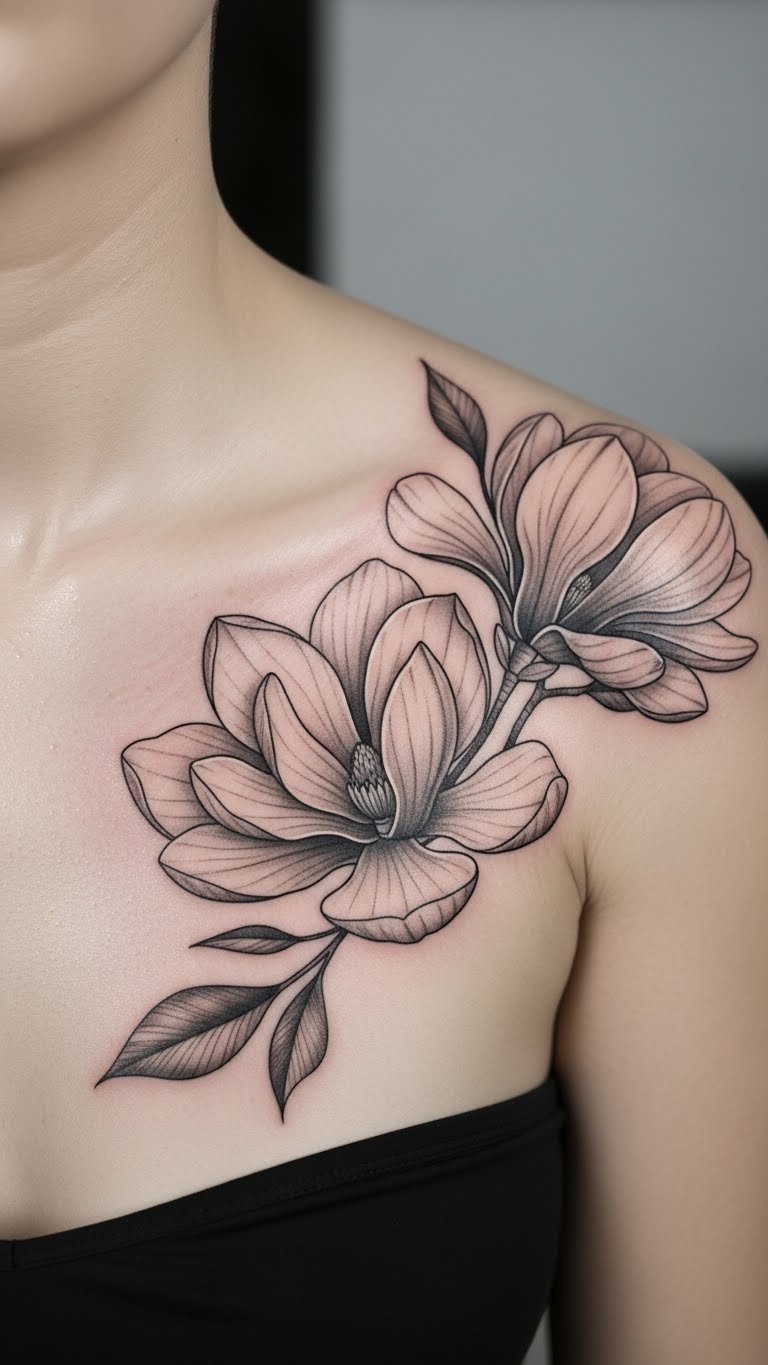 Choose a magnolia for your shoulder. It stands for strength. Draw a rough version on your body with washable markers. They are cheap at $2. Find a nearby shop for $100. Artists use simple needles. Keep the design medium-sized. It fits the area. This spot hides easily. Use it as a personal boost. Bold the key: shoulder strength. Practice with stick-and-poke kits if you’re handy. They cost $20 online. Follow safe steps. Clean tools well. It celebrates resilience.