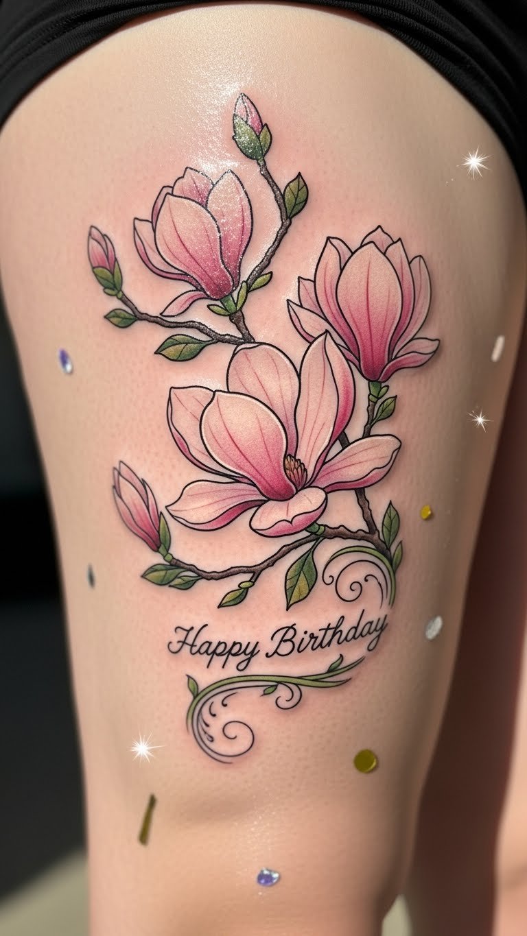 Birthday magnolia on thigh. Marks milestones. Plan with calendars. Free. Get for $150. Bold the key: milestone birthday. Use birthday cards.