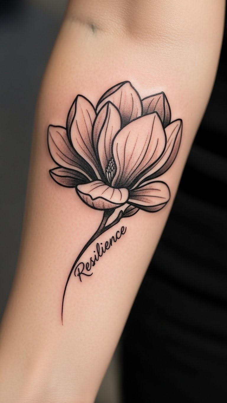 Resilience magnolia on forearm. Builds inner strength. Scribble ideas. Free. Artists $130. Bold the key: resilience theme. Journal thoughts.