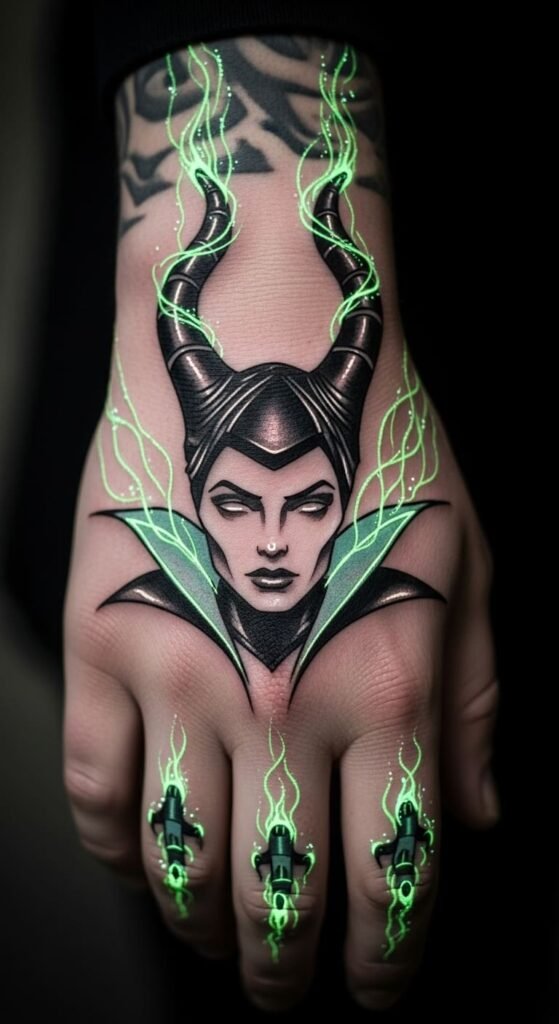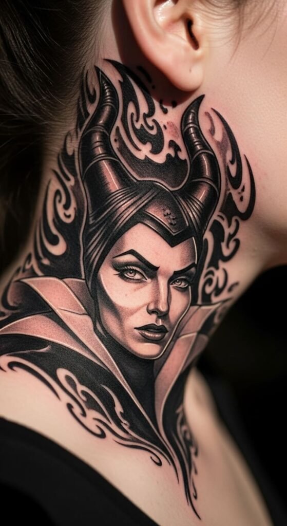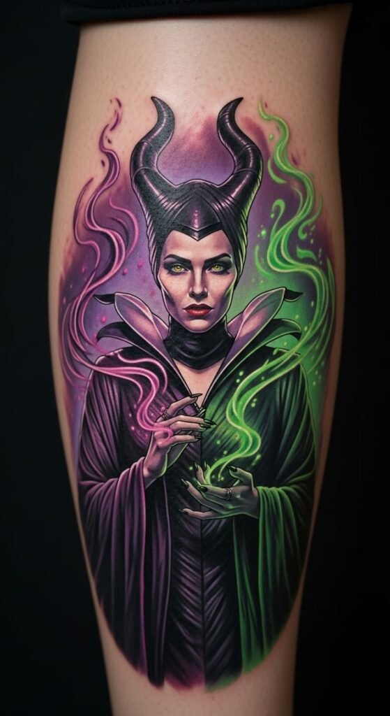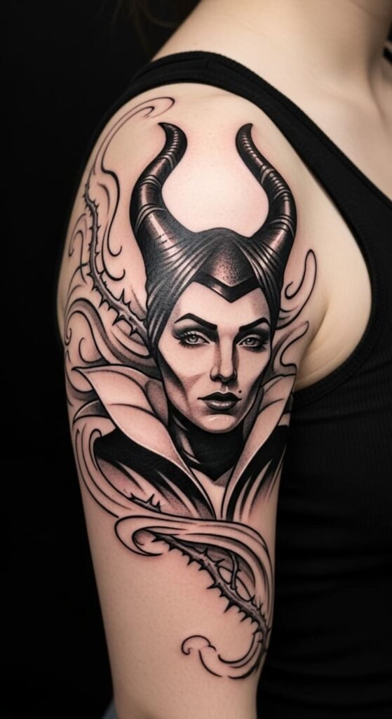 Shoulder tattoos give Maleficent a bold stage. They fit detailed work well. Plan with a free template online. Pick a design that flows with your body. Find an artist for about $150. Mix in a small extra element. Test it with body paint at home. This placement feels empowering and practical.