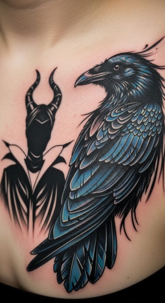 Ravens pair with Maleficent for added depth. They show loyalty in ink. Draw a bird shape quickly at home. Use basic tools for this. Aim for $150 total cost. Combine with the main figure. Practice with stencils. This creates a storytelling pair.