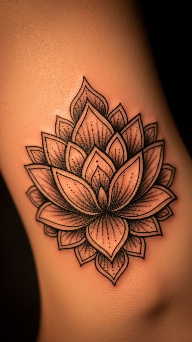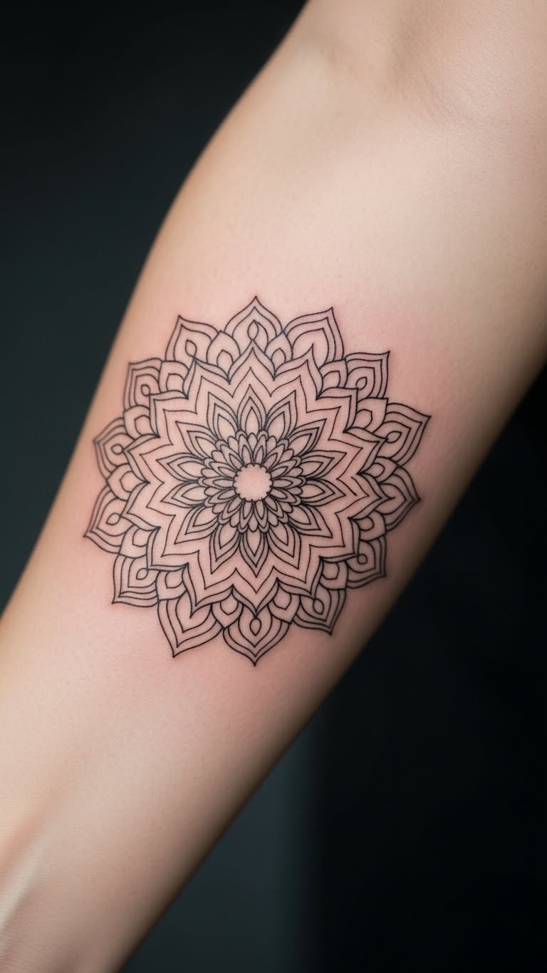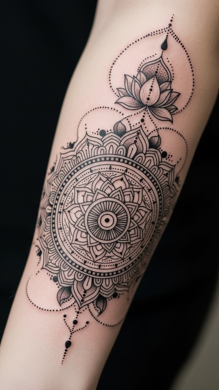 The lotus in mandalas stands for purity and rising above challenges. It shows growth from tough spots, like a flower from mud. Try a DIY sketch on your arm with markers to see how it looks. Pick affordable art supplies from a dollar store for practice. Place this design on your foot for a subtle reminder during walks. A local shop might offer deals on smaller tattoos. Combine it with simple lines for a custom feel. Real tip: Draw the lotus step by step at home to build your design. This makes the process fun and low-cost. Use it as a daily prompt for reflection. Keep things easy to achieve real inner calm.