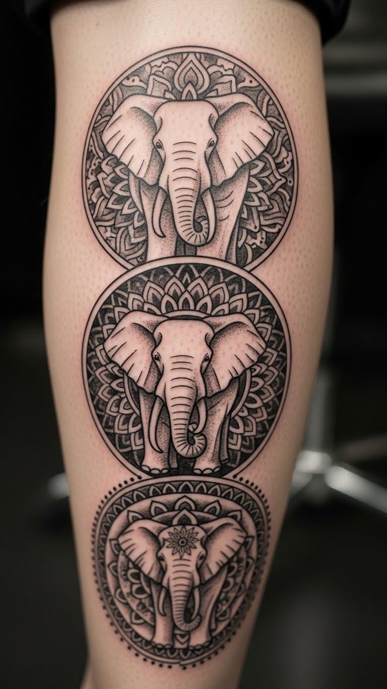 Elephants in mandalas represent wisdom and memory. They remind you to stay grounded. Draw one with basic crayons at your desk for practice. It’s an inexpensive start. Place it on your leg for a personal touch. Find budget artists online for quotes. Mix it with other shapes for uniqueness. Real tip: Use old magazines to cut and paste elephant ideas before inking. This keeps costs down. Let it guide your daily decisions. Easy actions lead to meaningful results.