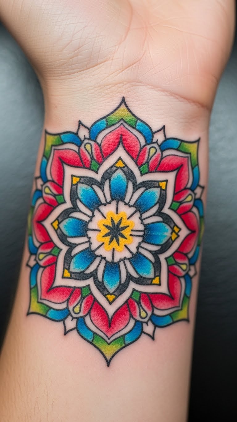 Colors in mandalas add energy and feelings to your design. Red might spark passion, while blue brings calm. Experiment with colored pencils at home for free. Try small sketches to test ideas. Get this on your hand for constant visibility. Opt for sales at tattoo studios to cut expenses. Choose hues that match your mood. Real DIY: Mix watercolors with paper for mock-ups. This way, you plan affordably. Use colors to enhance your peace routine.