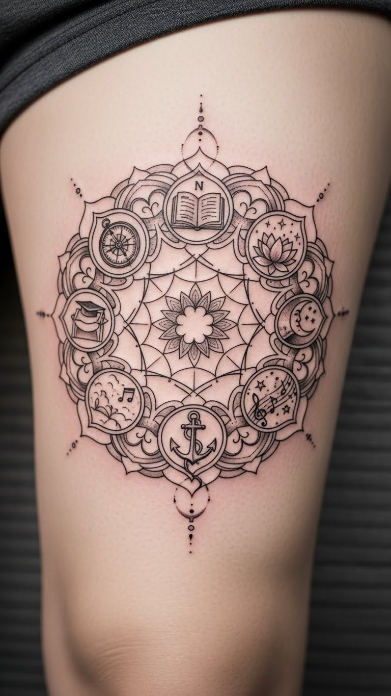 Personal journey maps in mandalas tell your story. They track growth. Map your life on paper first. Straightforward. Tattoo on your thigh for a timeline. Find personalized deals. Add milestones. Real tip: Use a journal to outline your design. It’s personal and cost-effective.
