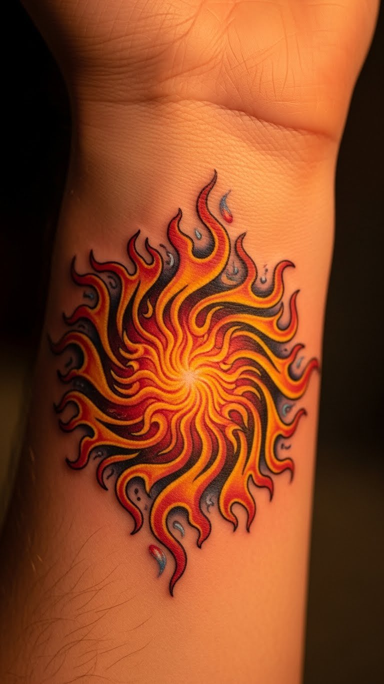 Flames stand for energy. Blend them in. Draw flames on napkins. Use fire videos for ideas. Make it fiery yet basic. Pick cheap red inks. Place it on your wrist. Try flame stickers first. This sparks creativity. Do it as a group.
