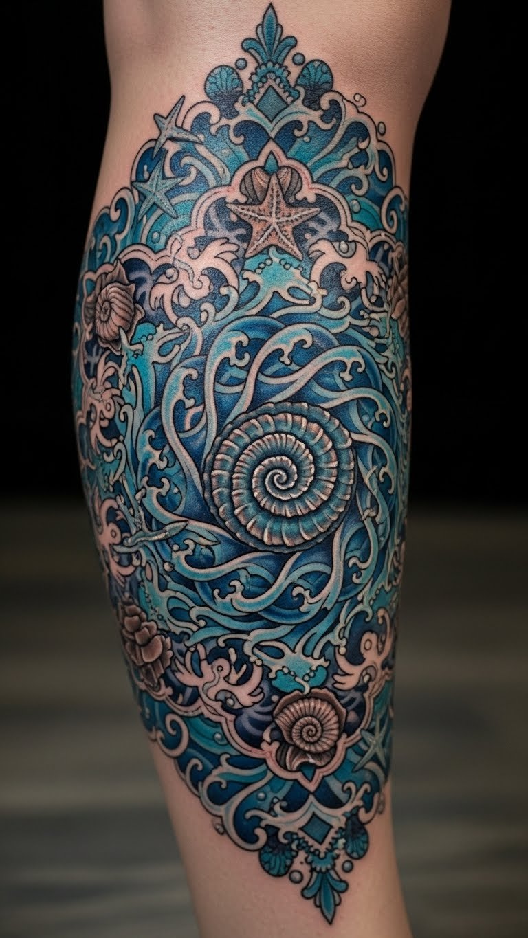 Oceans bring peace. Layer in sea elements. Sketch waves at the beach. Find ocean art online. Make it deep and simple. Choose blue tones cheaply. Put it on your lower leg. Practice with sea shells. This flows naturally. Do it near water.