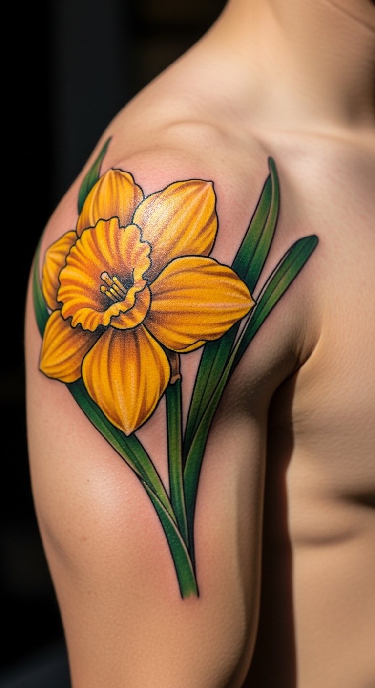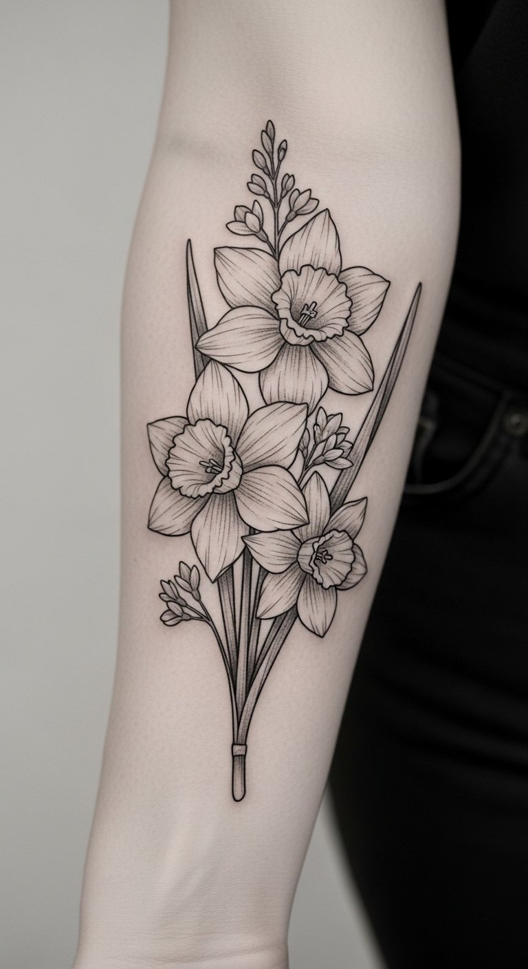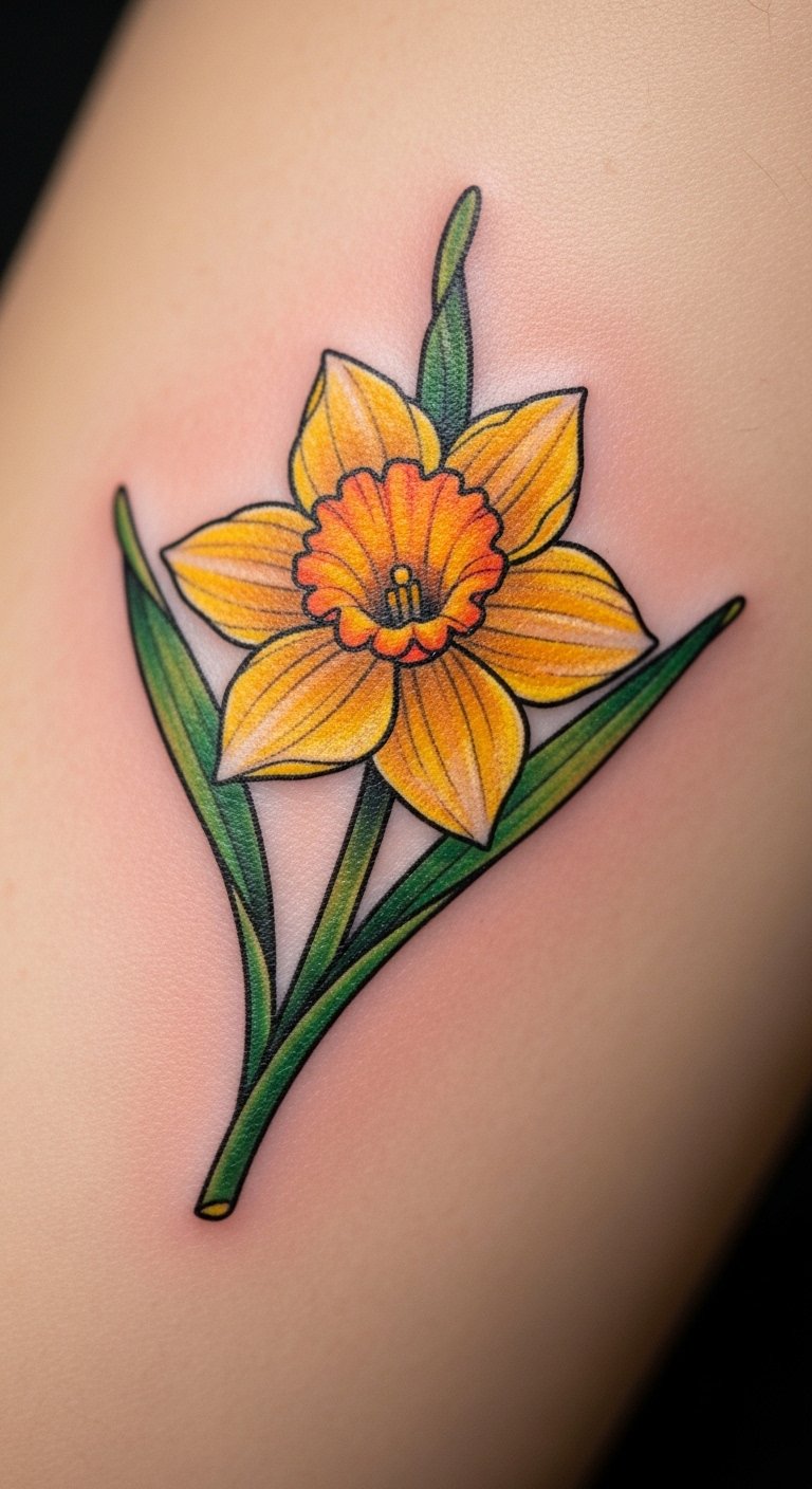 A classic daffodil outline keeps things straightforward and elegant. Start with a basic sketch on paper using a pencil and trace it freehand. This style works well for first-timers. Pick a spot like your wrist for easy hiding. For a budget option, grab markers from a dollar store to practice designs at home. Add a small jonquil next to it for variety. Keep colors simple—stick to black ink. This design pops as a symbol of hope. Try pairing it with a family member’s input for fun. You’ll love how it feels personal without overwhelming your skin. Go for a local artist who offers quick sessions to save money. Simple tweaks make it your own.