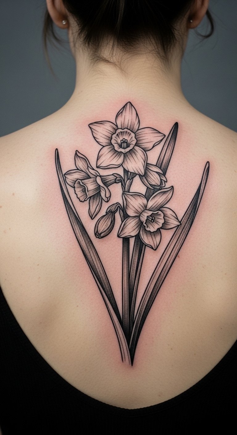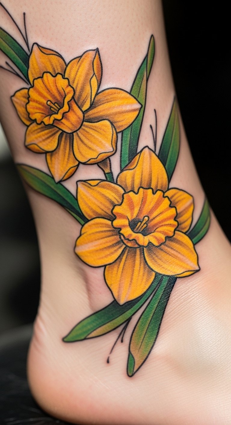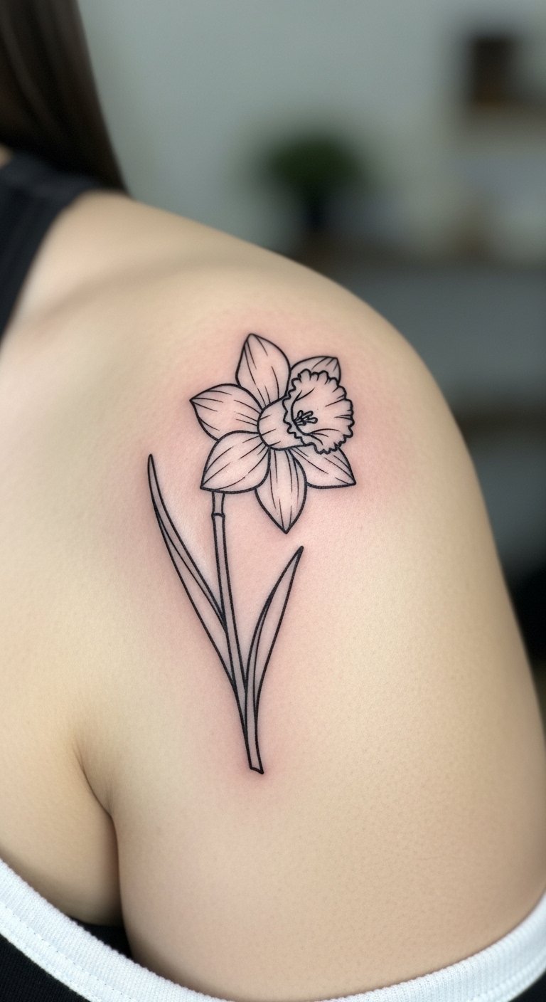 A classic daffodil outline keeps things straightforward and elegant. Start with a basic sketch on paper using a pencil and trace it freehand. This style works well for first-timers. Pick a spot like your wrist for easy hiding. For a budget option, grab markers from a dollar store to practice designs at home. Add a small jonquil next to it for variety. Keep colors simple—stick to black ink. This design pops as a symbol of hope. Try pairing it with a family member’s input for fun. You’ll love how it feels personal without overwhelming your skin. Go for a local artist who offers quick sessions to save money. Simple tweaks make it your own.
