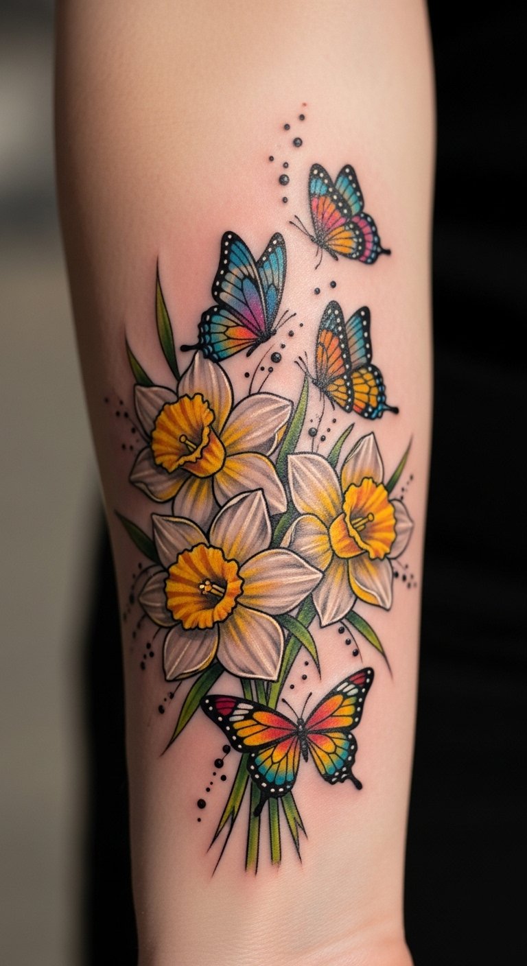 Create a spring bouquet with butterflies for a lively feel. Sketch flowers and wings on plain paper using colored pencils—it’s an affordable prep step. Place it on your wrist for everyday visibility. Include a few daffodils and jonquils in the mix. This idea ties into nature themes easily. Use online templates to guide your drawing at home. Keep costs down by choosing compact designs. Add butterflies for a fun, symbolic layer. Practice with stickers before the real deal. It becomes a personal story on your skin.