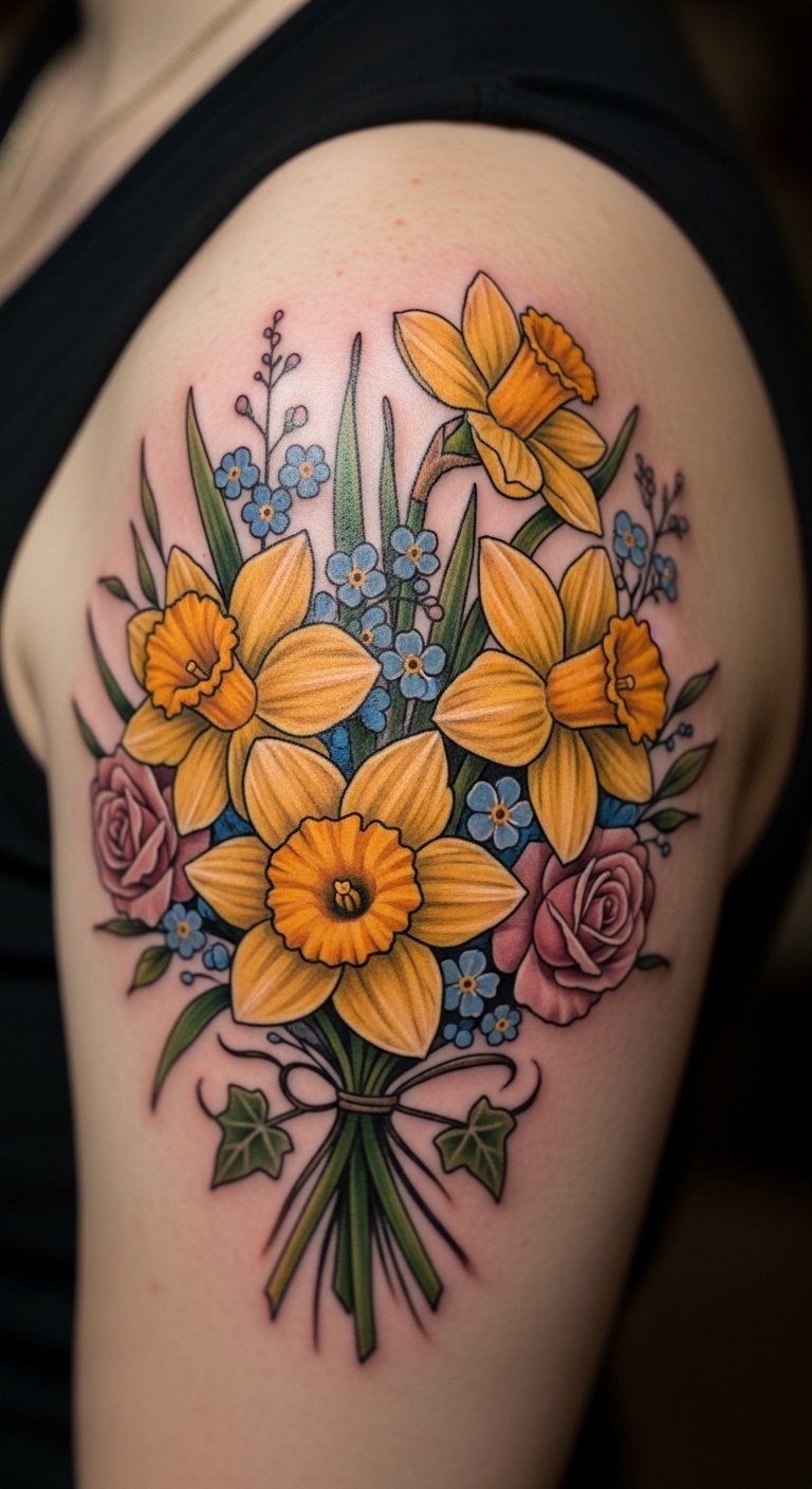 Build a family bouquet with multiple birth flowers for shared meaning. Draw simple clusters on scrap paper with markers to plan ahead. Position it on your shoulder for a meaningful spot. Include daffodils and jonquils alongside others. This approach fosters connections without high costs. Use family photos as inspiration for your sketch. Look for artists who do group discounts. Make it unique by adding personal touches like initials. It’s a great way to honor loved ones affordably.