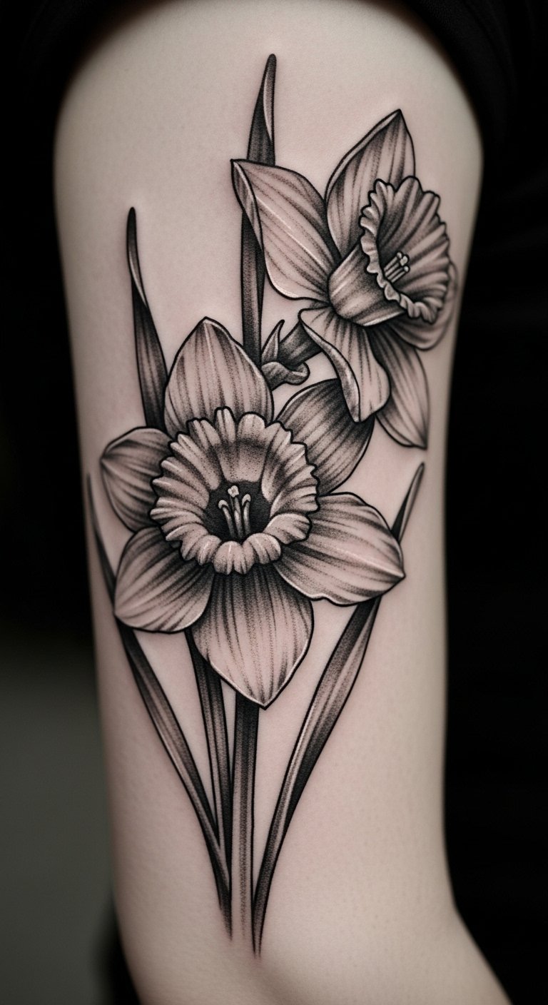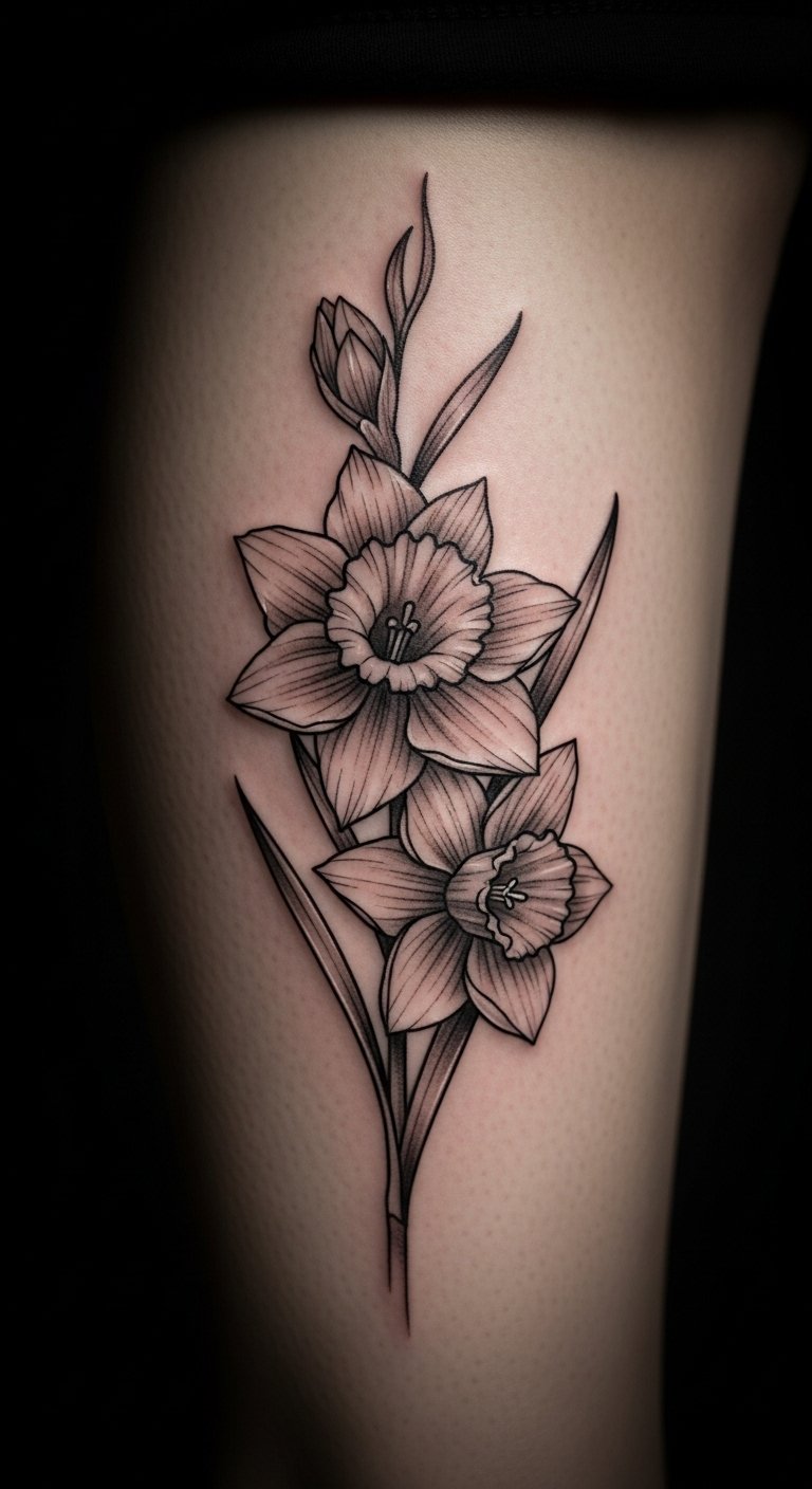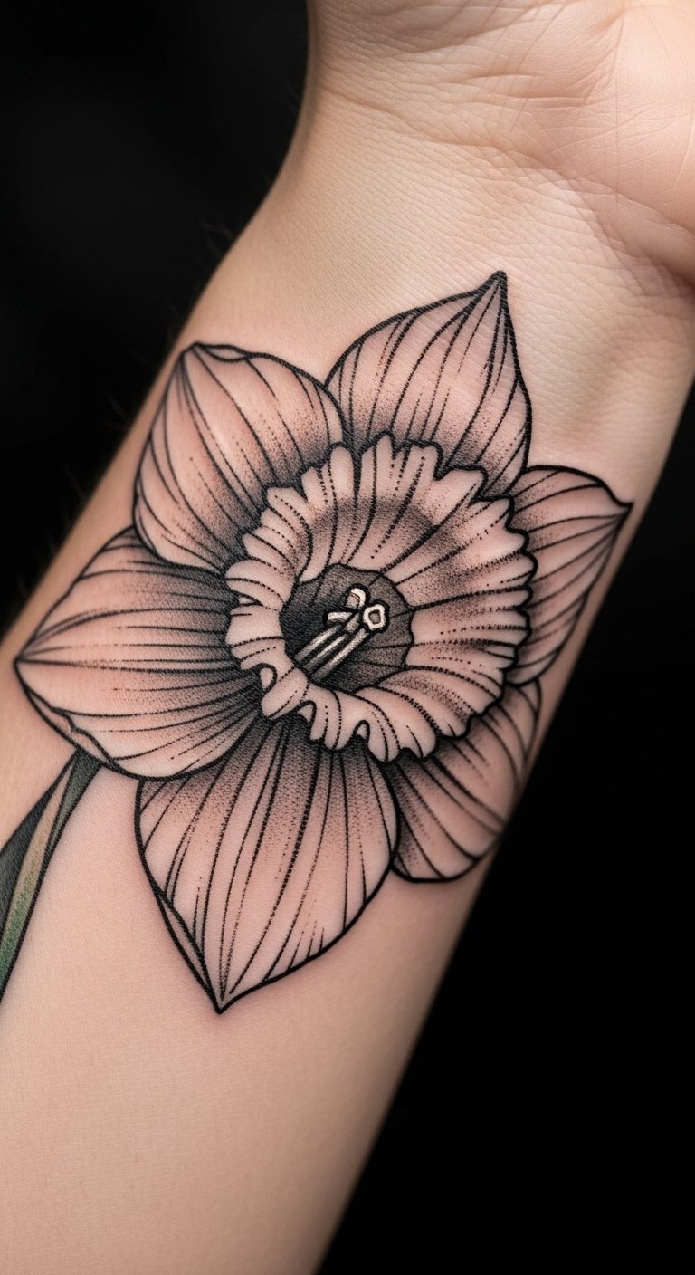 Black and grey daffodil gives a timeless vibe. Start with graphite pencils on paper to sketch ideas cheaply. Place it on your arm for versatile wear. Focus on shading for texture without colors. This style suits any outfit. Download free drawing tools to refine your concept. It helps avoid extra fees by clarifying your vision. Add a jonquil for depth.