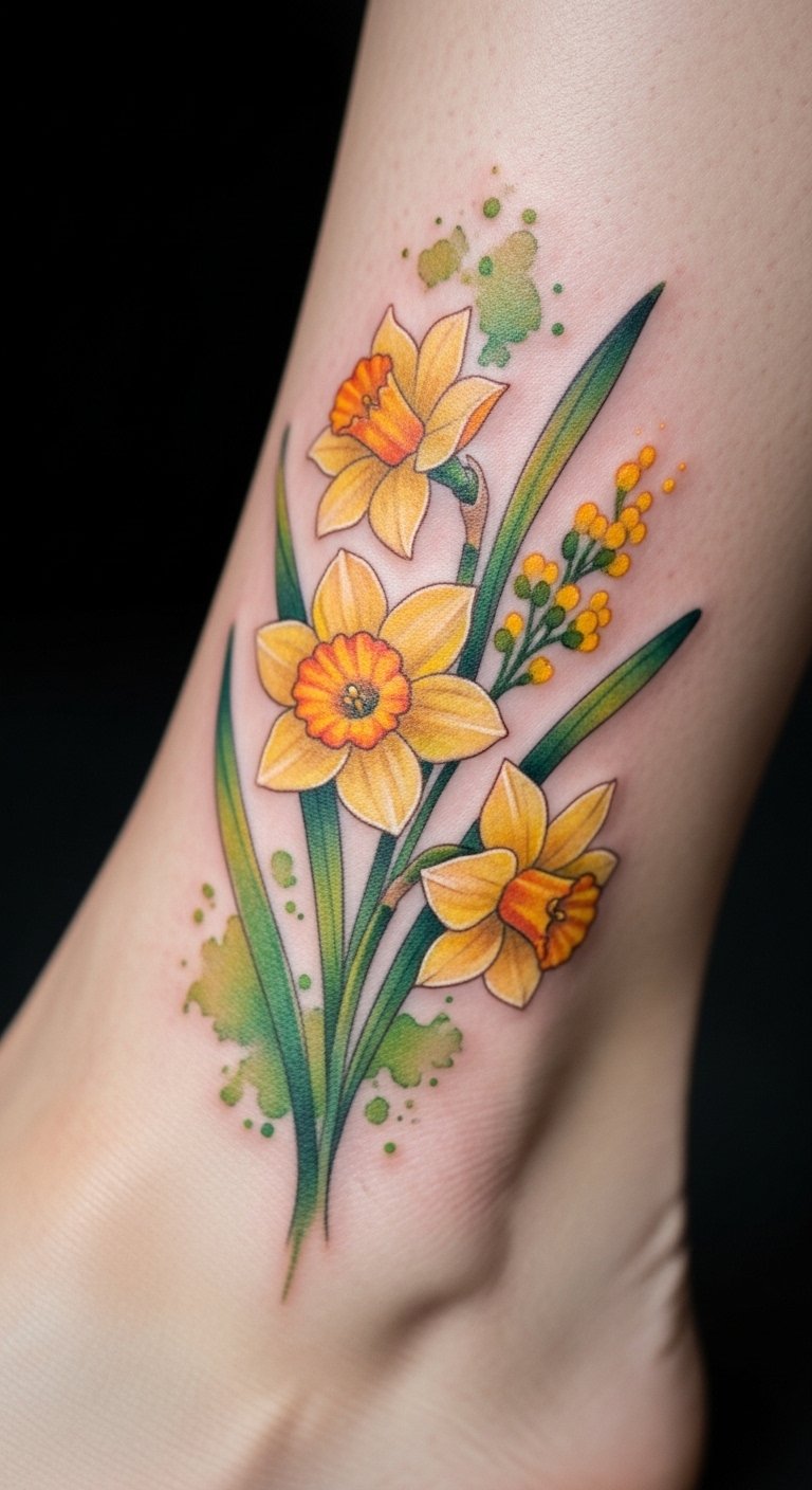 Watercolor March flowers bring an artistic flow. Use watercolors and paper to experiment at home—it’s budget-friendly. Put it on your ankle for a creative pop. Blend yellows and greens for that painted effect. This design feels fresh and symbolic. Watch online tutorials for easy tips. Opt for smaller versions to save money. It turns your skin into a canvas.