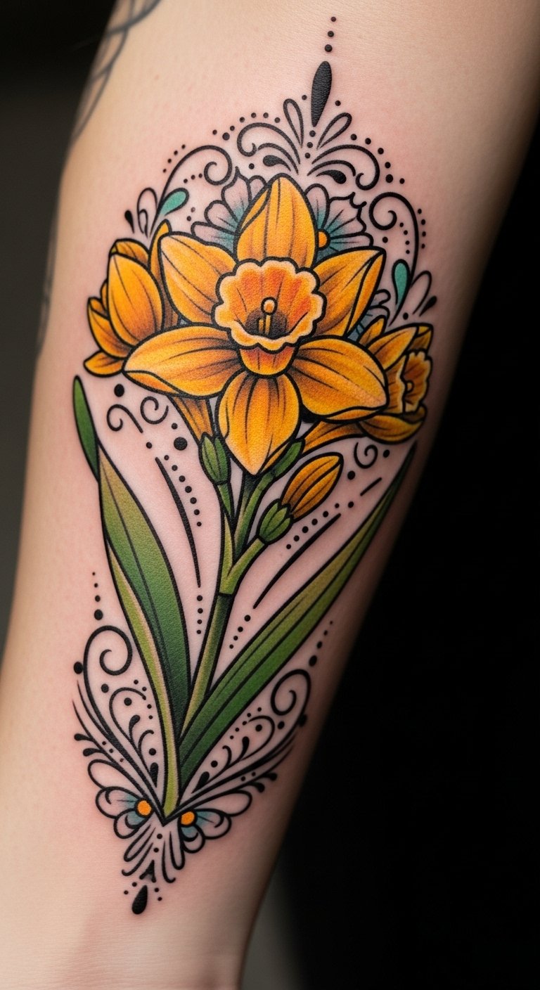 Neo-traditional jonquil adds classic flair. Draw bold lines on cardboard with markers as a start. Place it on your forearm for impact. Incorporate traditional elements like patterns. This idea keeps things meaningful. Use affordable stencils for practice. Find deals on sessions to fit your budget. Make it personal with small changes.