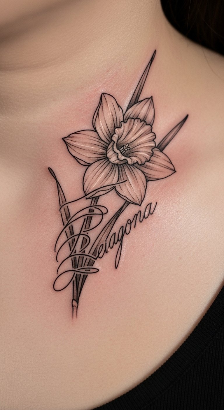 Personalize with a name and daffodil for sentiment. Write your name next to a flower sketch on paper. Place it on your collarbone for intimacy. Add the flower as a border. This makes it uniquely yours. Use free fonts online for inspiration. Keep it small to lower costs. It’s a heartfelt choice.