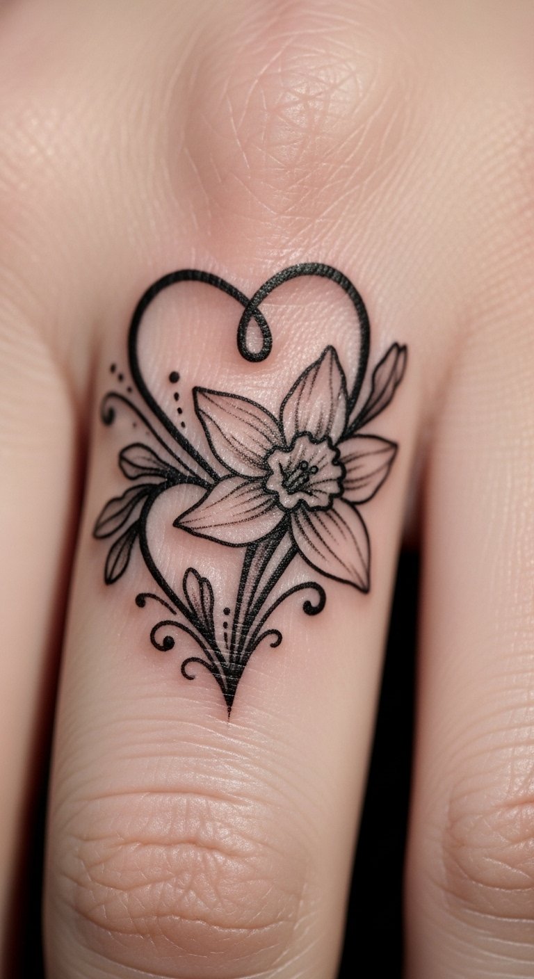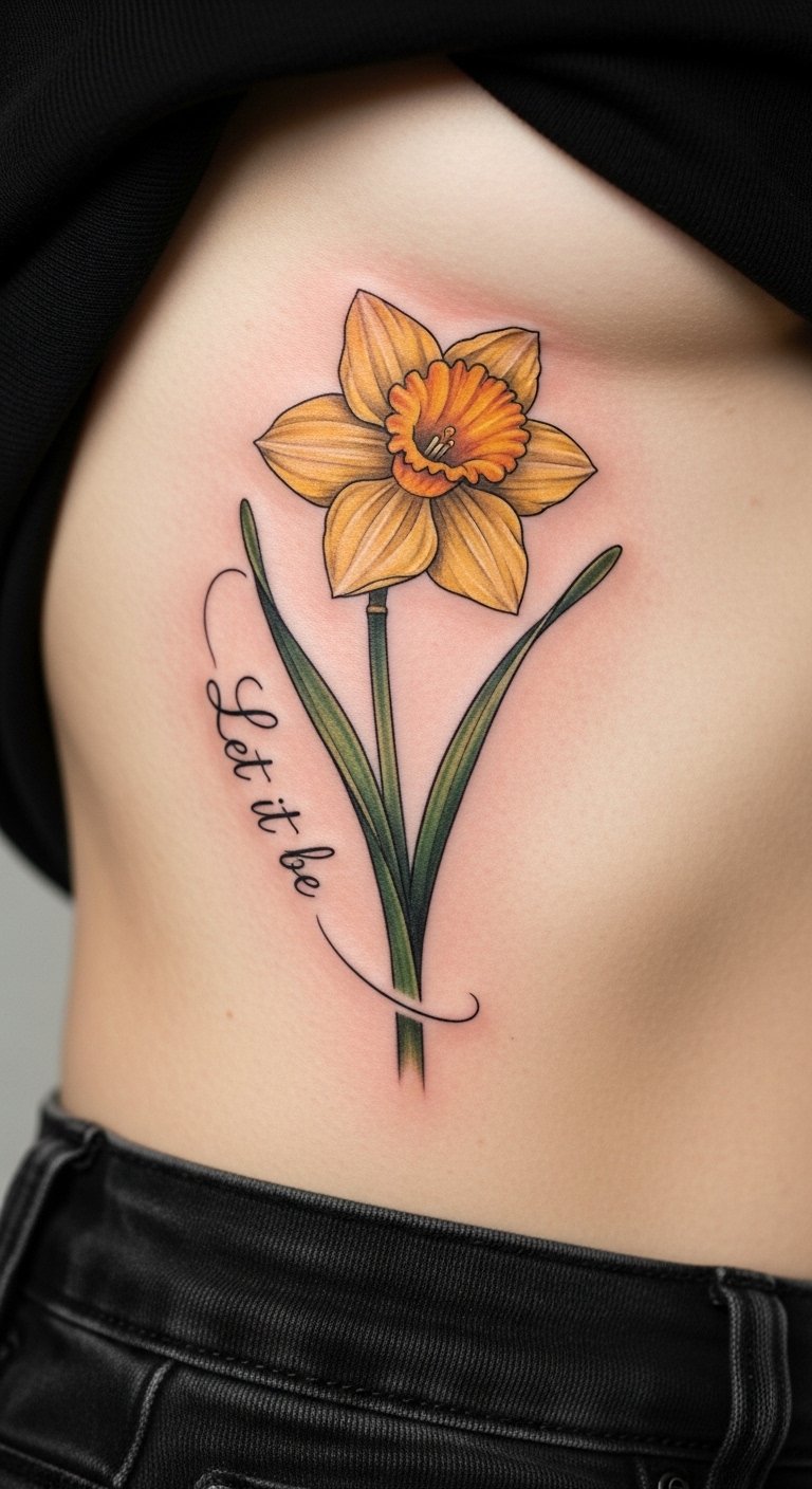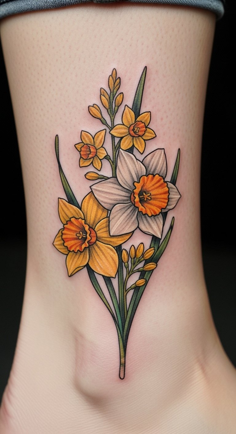 Go bold with a vibrant yellow daffodil to brighten your look. Use yellow markers and green crayons to doodle ideas on paper first—it’s a cheap way to experiment. Place it on your ankle for a playful touch. Mix in orange shades for extra flair using affordable colored pencils. This tattoo shines as a sign of optimism. Ask a friend to help sketch variations at home. Opt for smaller sizes to cut costs at the studio. Add a jonquil element for balance. You’ll find it easy to match with spring outfits. Keep the process light by trying temporary versions from online shops first.