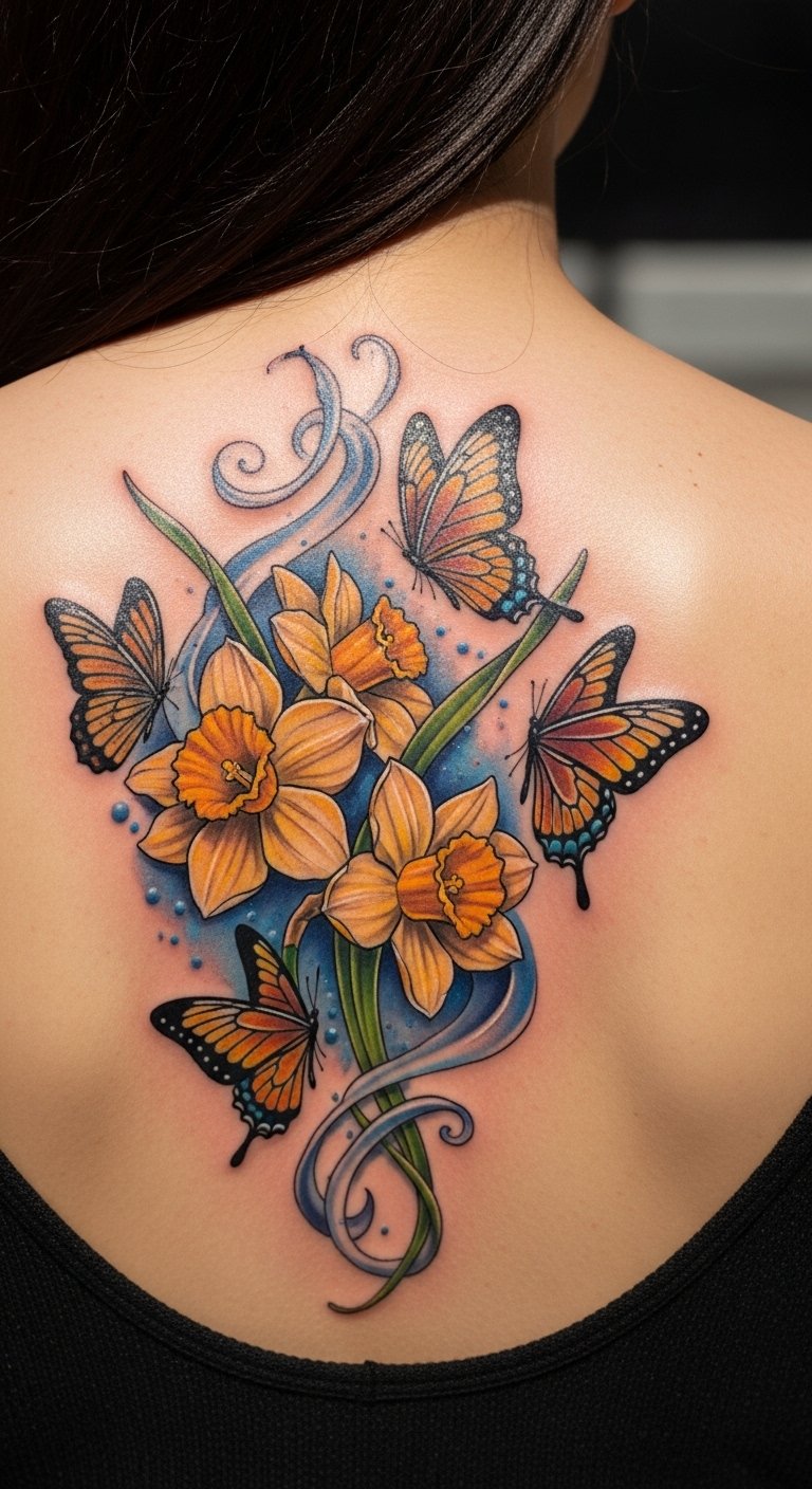 Nature-inspired butterfly and daffodil mix beauty. Sketch butterflies around flowers on plain paper. Place it on your back for a larger canvas. Use simple shapes for ease. This design evokes spring. Find free nature images for ideas. It keeps things affordable and fun.