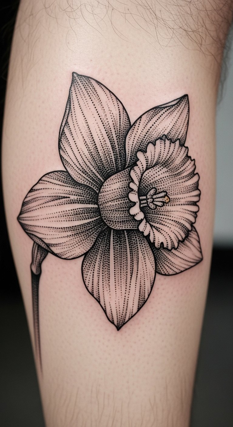 Dotwork daffodil offers unique texture. Use a dot-making pen on paper for practice. Put it on your calf for detail. Build patterns slowly. This style stands out. Watch DIY videos for tips. Keep sizes modest for costs.