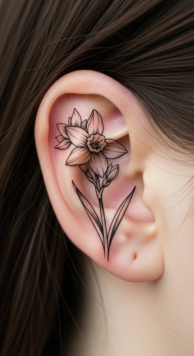 Behind the ear jonquil adds mystery. Sketch it on your ear with a mirror. This spot is discreet. Use minimal lines. It’s easy to hide. Try paper cutouts first. Affordable and quick.