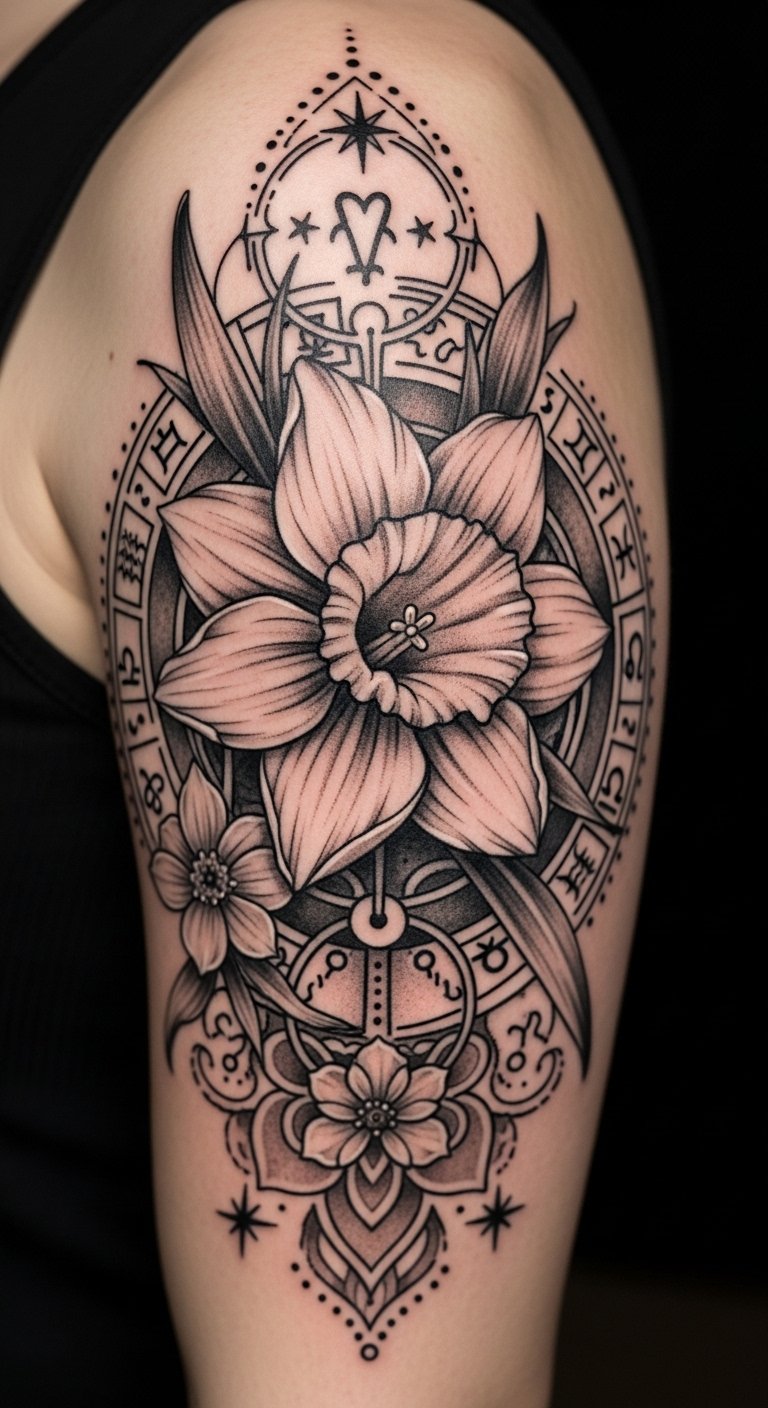 Custom astrological daffodil combos personalize deeply. Sketch stars around the flower on paper. Place it on your upper arm. Add your sign. This makes it special. Use free apps for designs. Budget-friendly tweaks help.